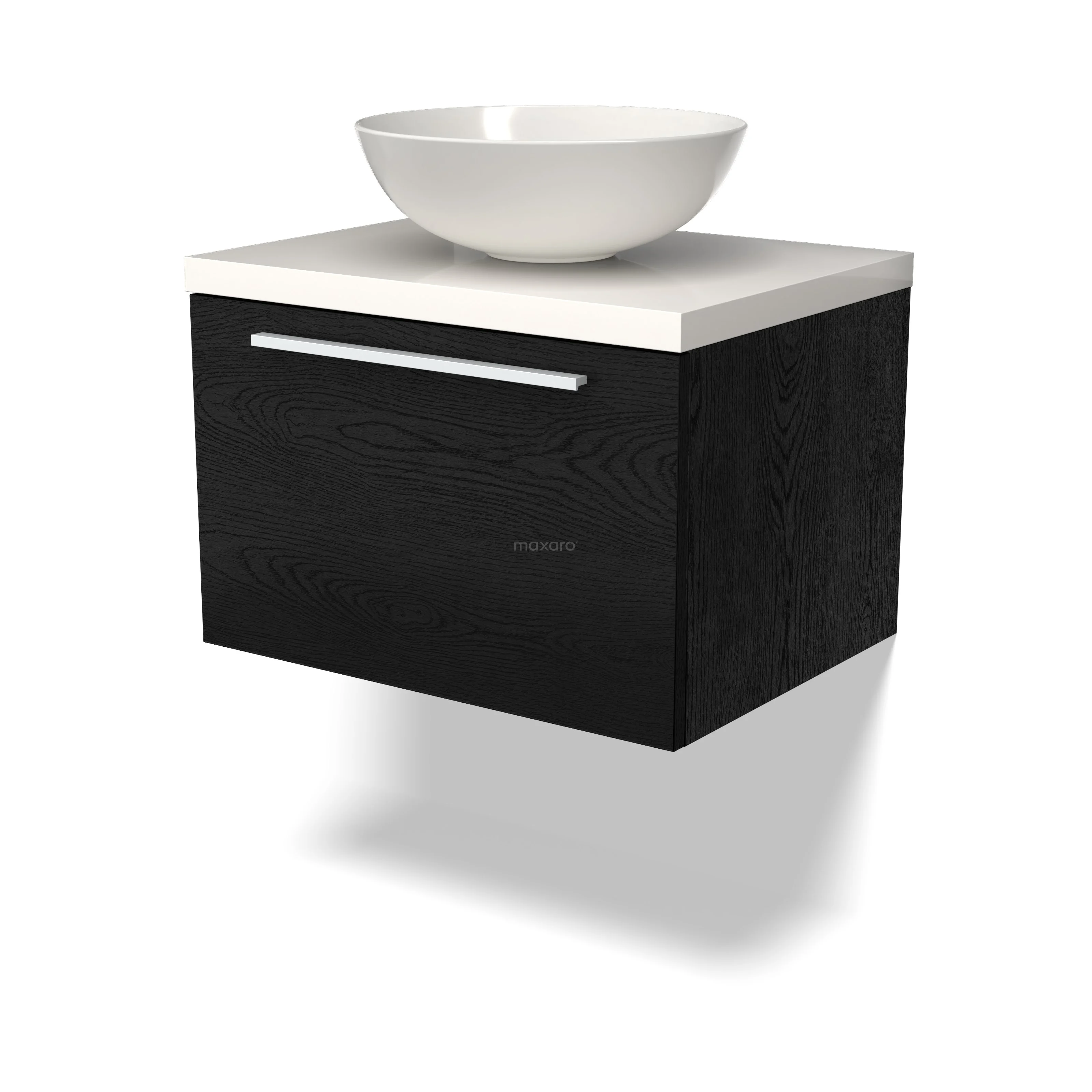 Modulo Plato Badmöbel mit Aufsatzwaschbecken | 60 cm Schwarze Eiche Flach front Hochglanz Weiß blatt 1 Schublade