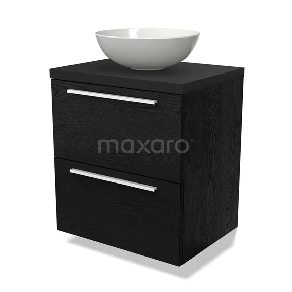 Modulo Plato Badmöbel mit Aufsatzwaschbecken | 60 cm Schwarze Eiche Flach front Matt Schwarz blatt 2 übereinanderliegende Schubladen