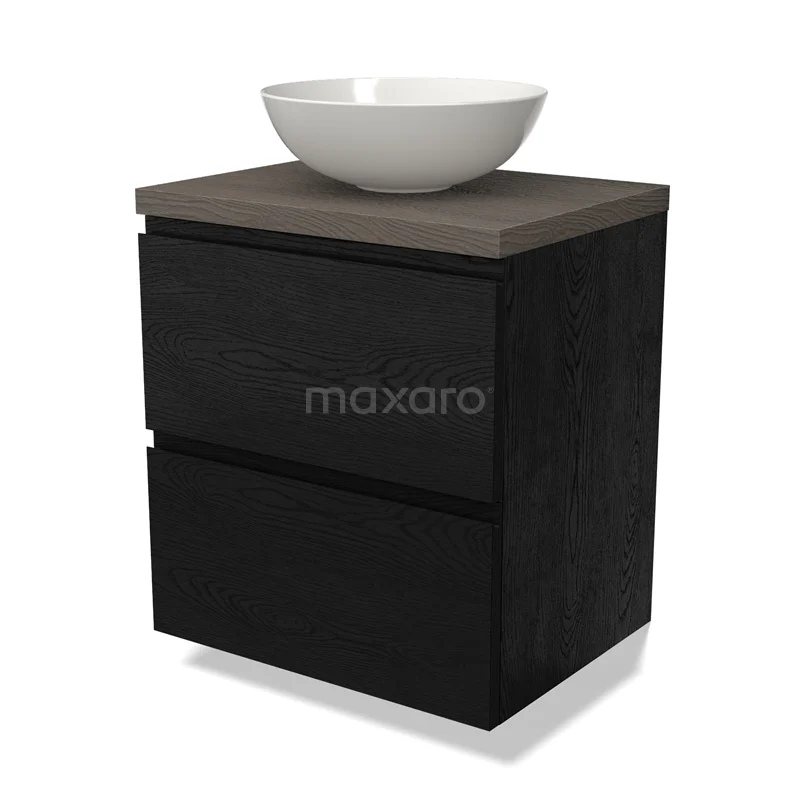 Modulo Plato Badmöbel mit Aufsatzwaschbecken | 60 cm Schwarze Eiche Grifflos front Dunkelbraune Eiche blatt 2 übereinanderliegende Schubladen