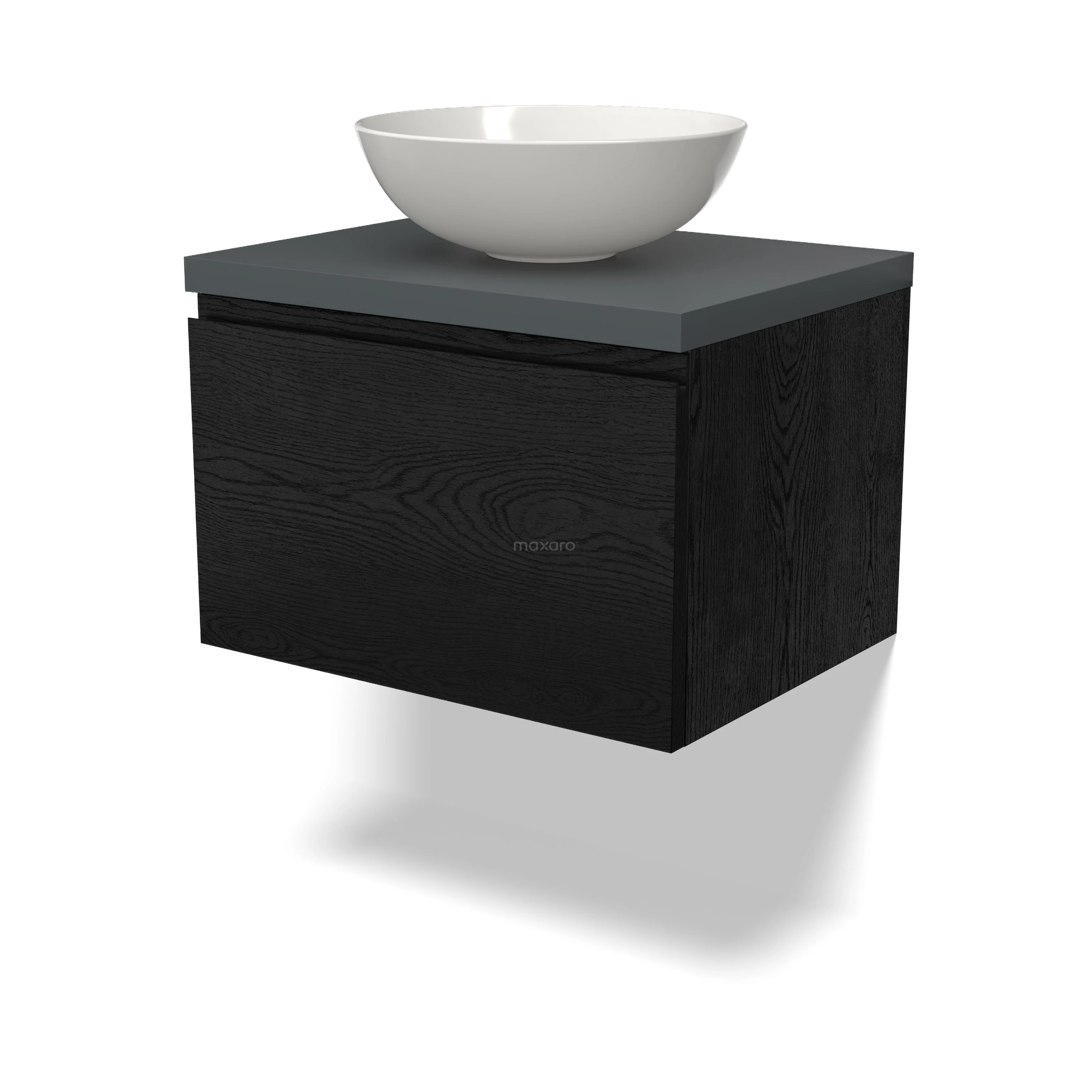Modulo Plato Badmöbel mit Aufsatzwaschbecken | 60 cm Schwarze Eiche Grifflos front Dunkelgrau blatt 1 Schublade