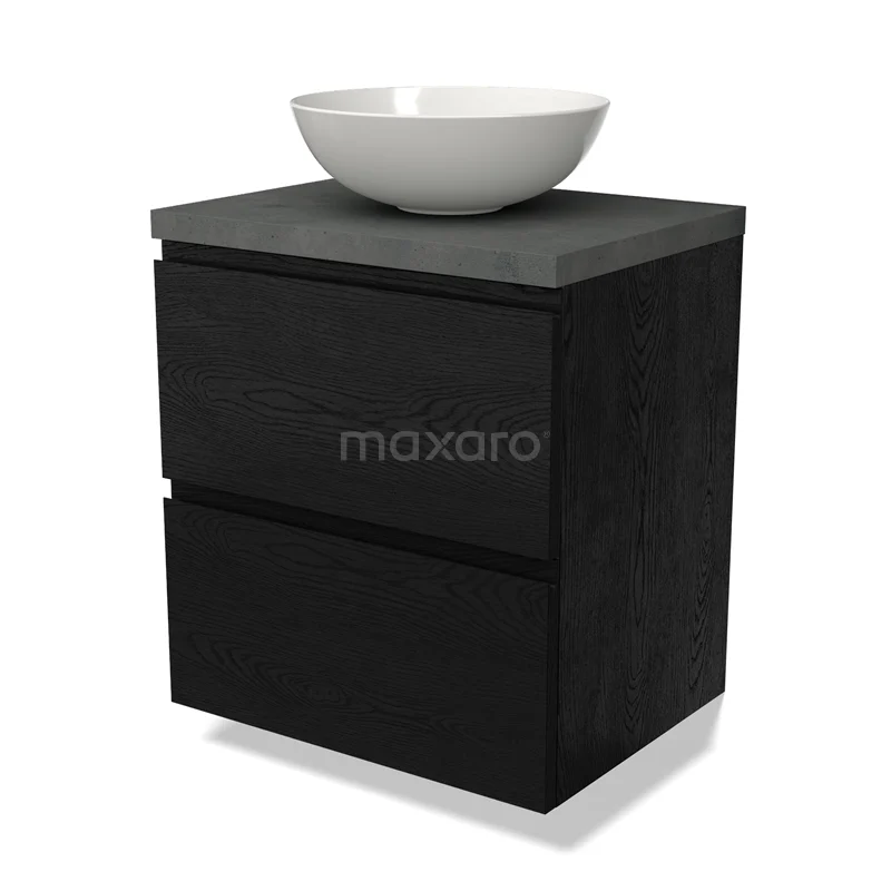 Modulo Plato Badmöbel mit Aufsatzwaschbecken | 60 cm Schwarze Eiche Grifflos front Dunkelgrauer Beton blatt 2 übereinanderliegende Schubladen