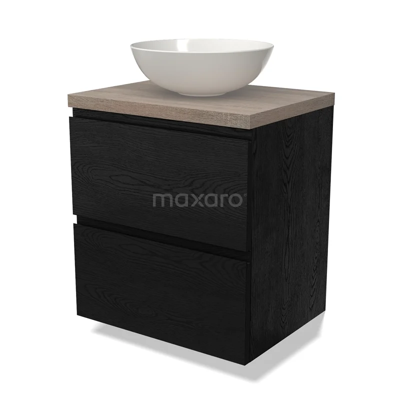 Modulo Plato Badmöbel mit Aufsatzwaschbecken | 60 cm Schwarze Eiche Grifflos front Eiche blatt 2 übereinanderliegende Schubladen