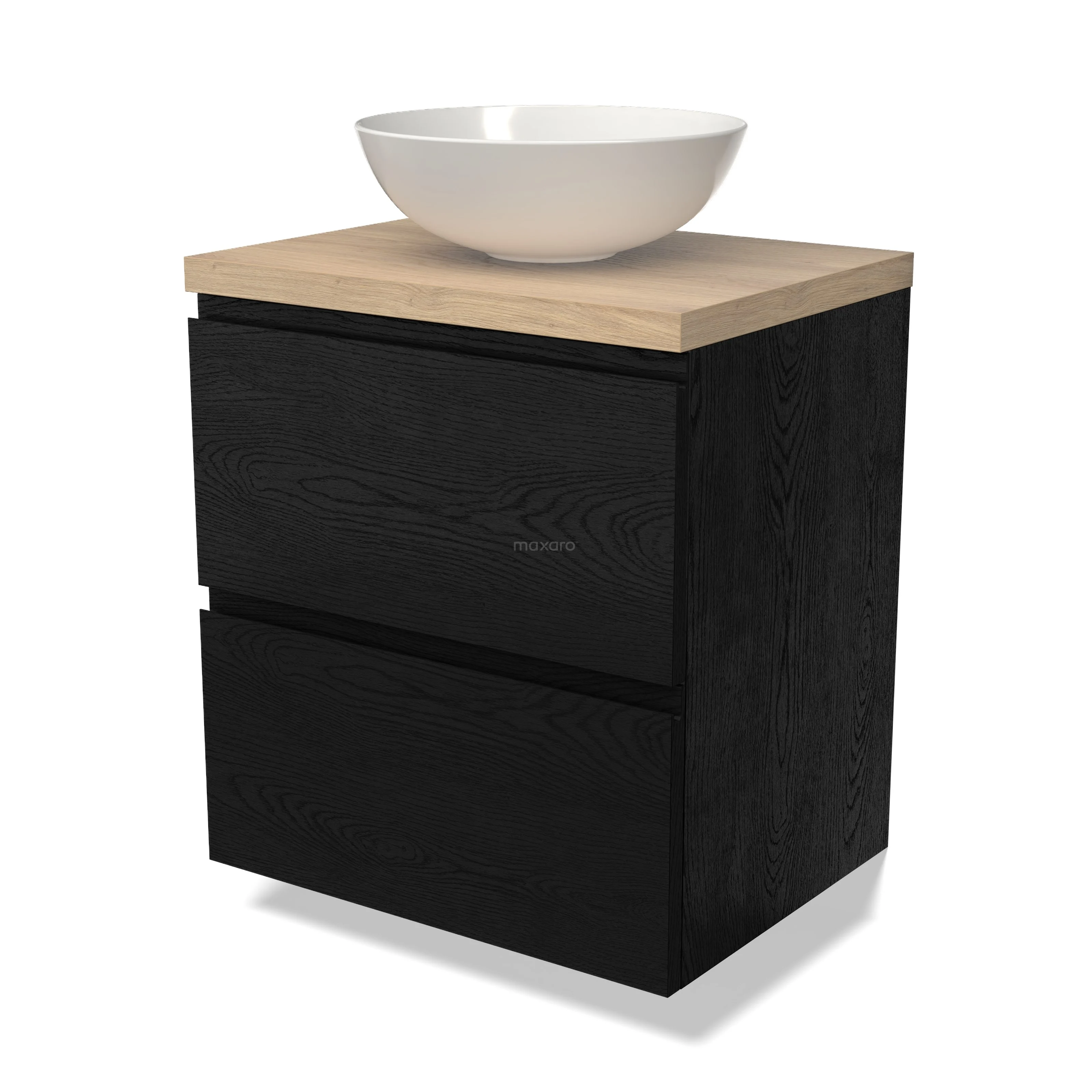 Modulo Plato Badmöbel mit Aufsatzwaschbecken | 60 cm Schwarze Eiche Grifflos front Hellbraune Eiche blatt 2 übereinanderliegende Schubladen