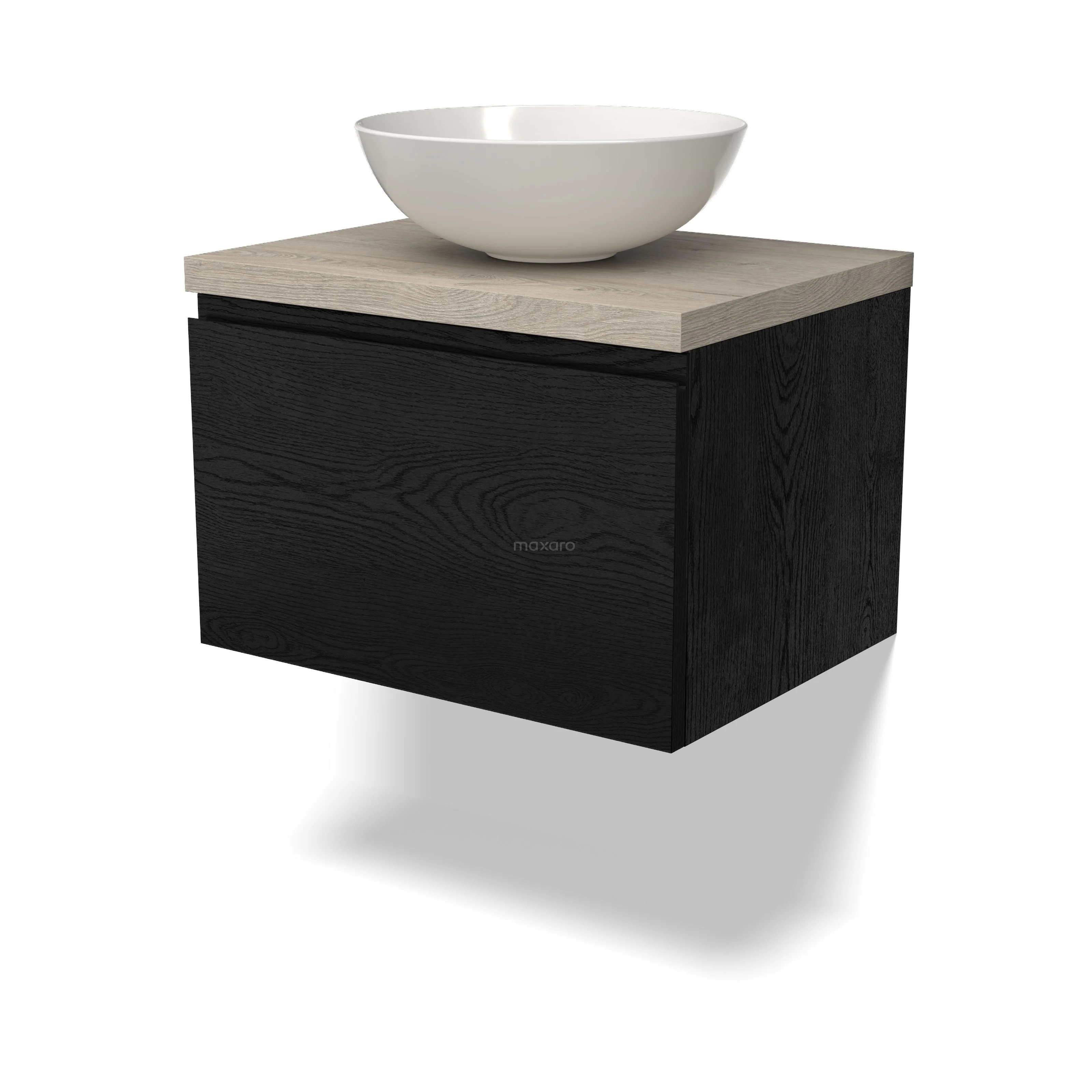 Modulo Plato Badmöbel mit Aufsatzwaschbecken | 60 cm Schwarze Eiche Grifflos front Hellgraue Eiche blatt 1 Schublade