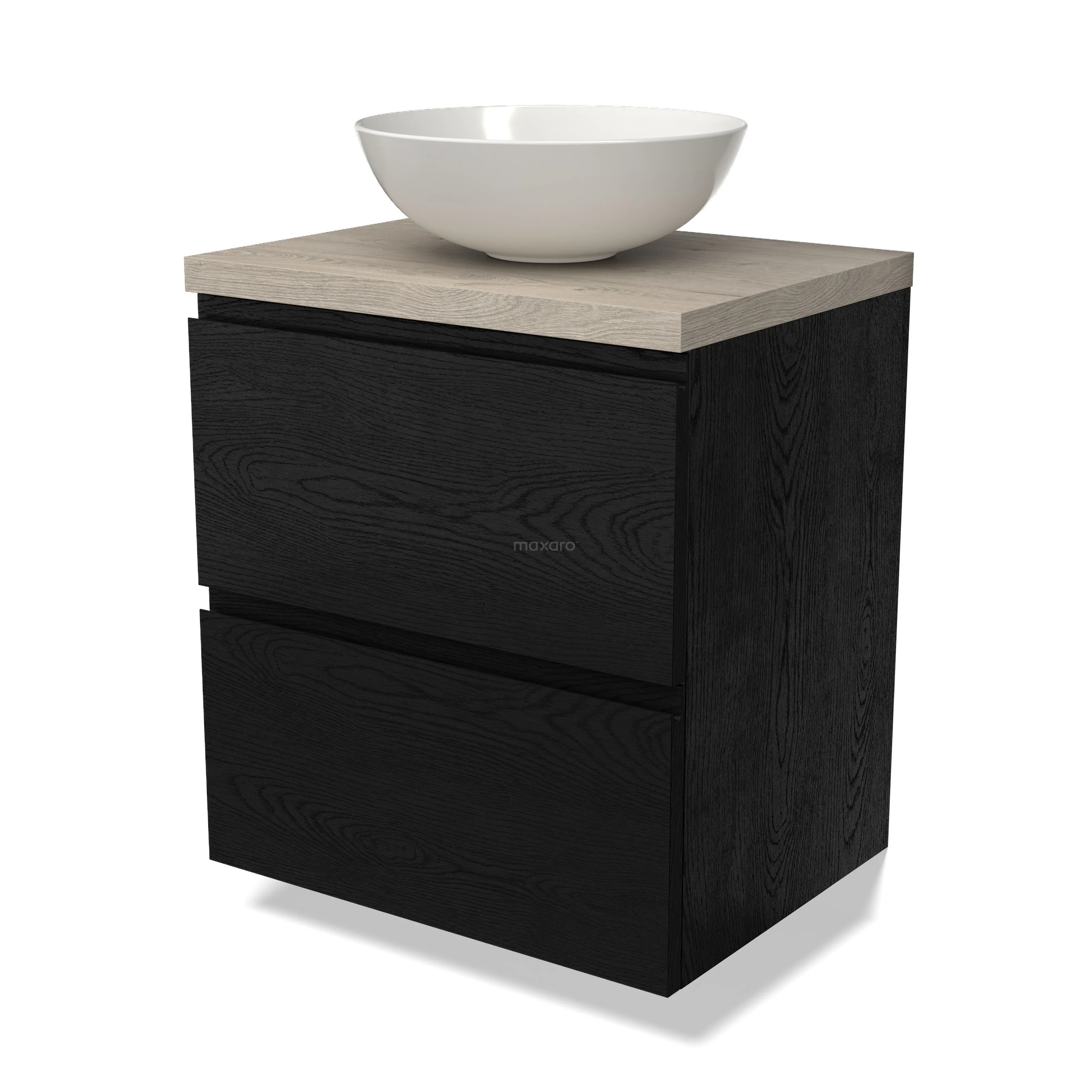 Modulo Plato Badmöbel mit Aufsatzwaschbecken | 60 cm Schwarze Eiche Grifflos front Hellgraue Eiche blatt 2 übereinanderliegende Schubladen
