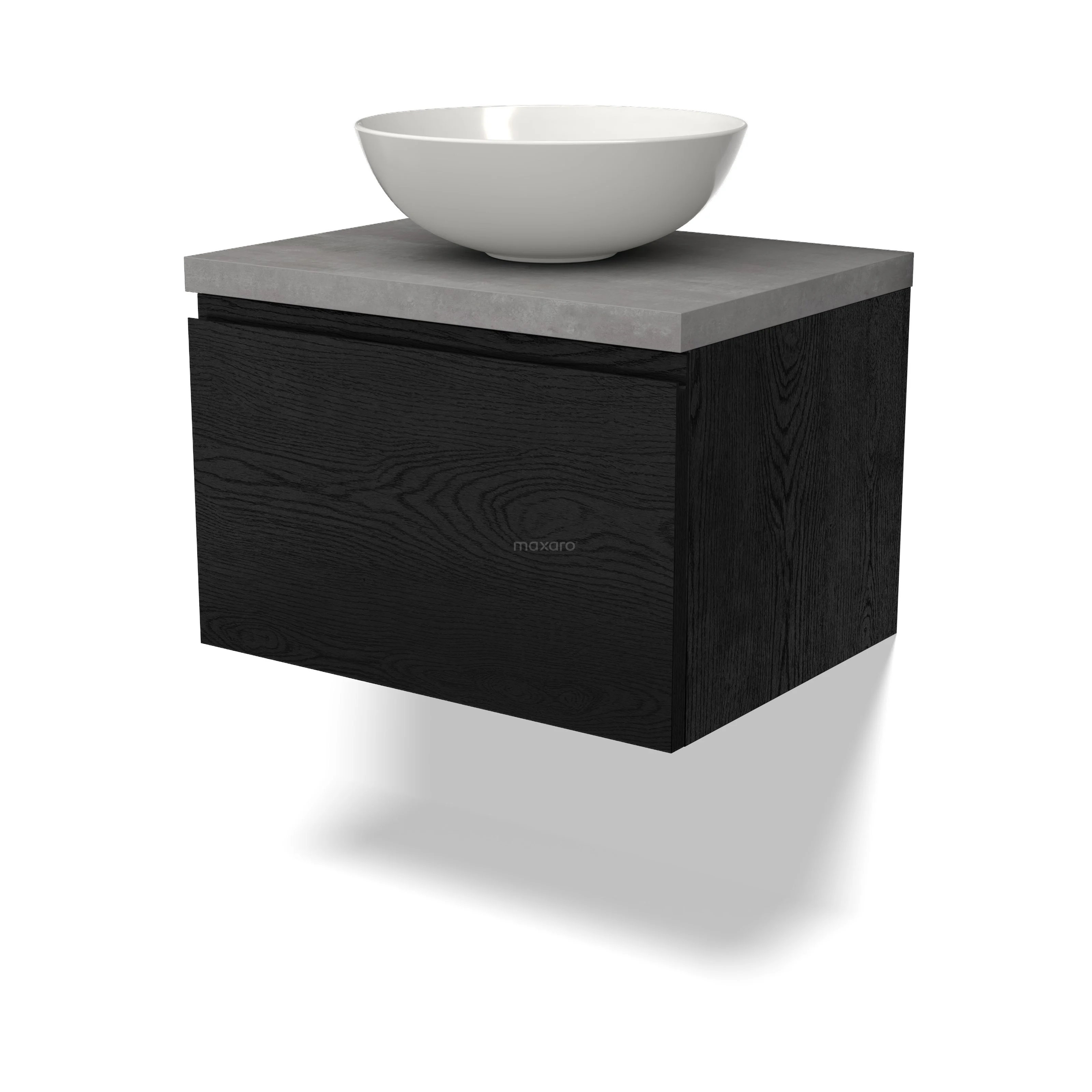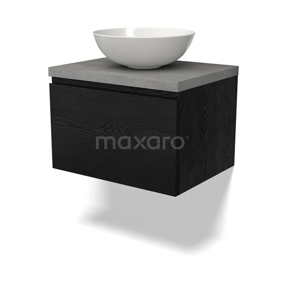 Modulo Plato Badmöbel mit Aufsatzwaschbecken | 60 cm Schwarze Eiche Grifflos front Hellgrauer Beton blatt 1 Schublade