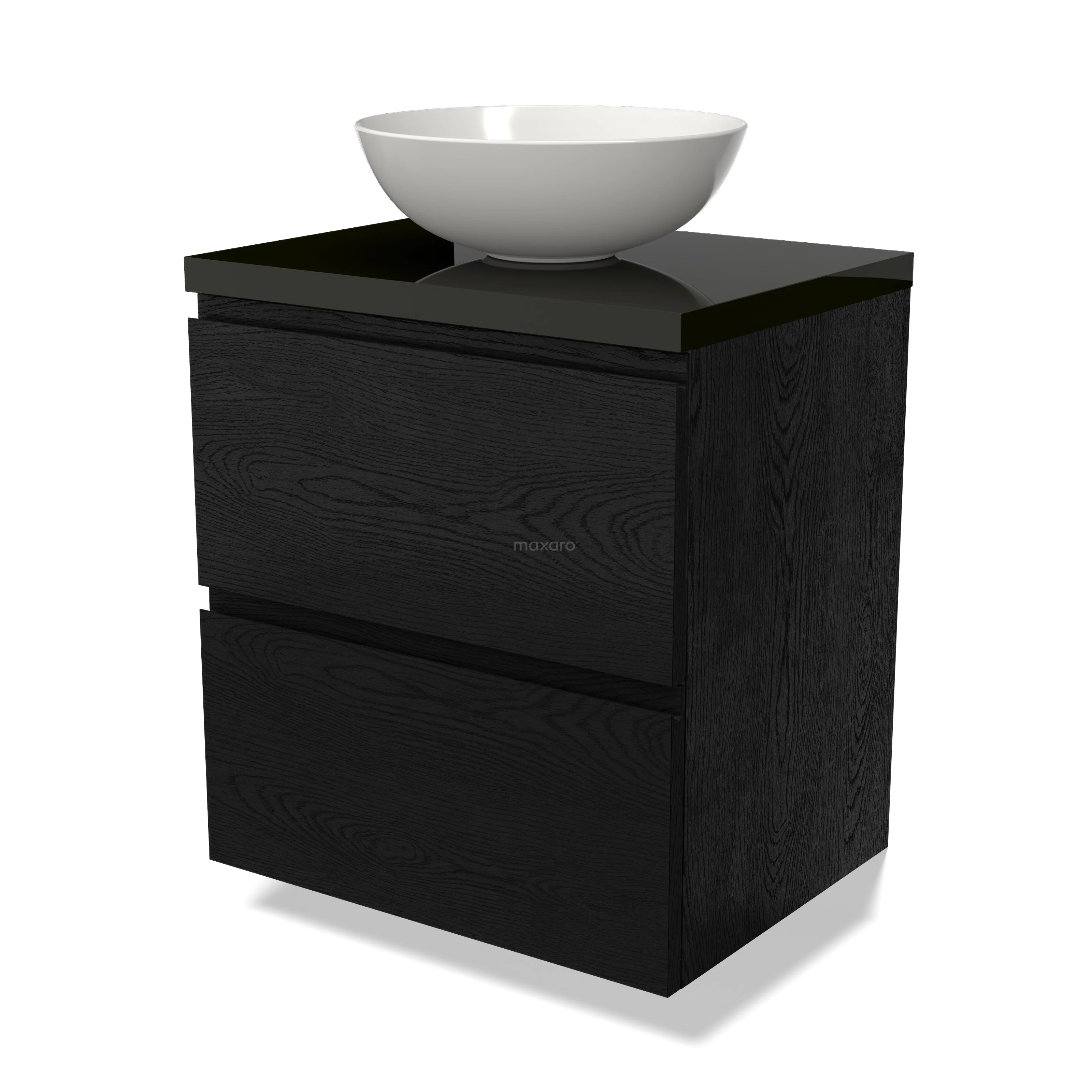 Modulo Plato Badmöbel mit Aufsatzwaschbecken | 60 cm Schwarze Eiche Grifflos front Hochglanz Schwarz blatt 2 übereinanderliegende Schubladen