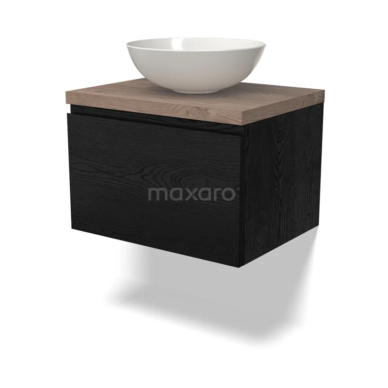 Modulo Plato Badmöbel mit Aufsatzwaschbecken | 60 cm Schwarze Eiche Grifflos front Mittelbraune Eiche blatt 1 Schublade