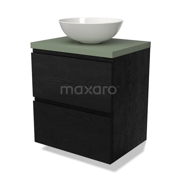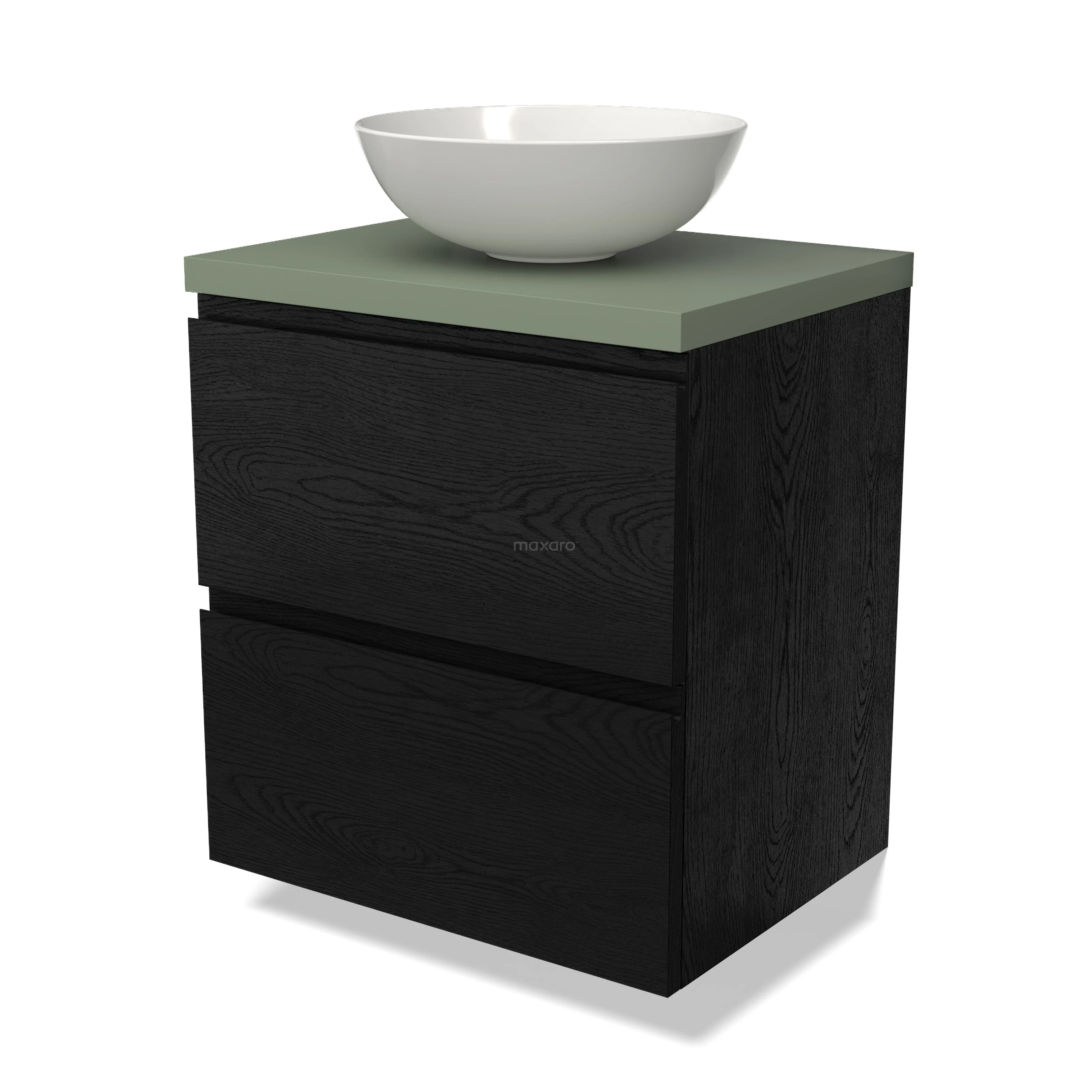 Modulo Plato Badmöbel mit Aufsatzwaschbecken | 60 cm Schwarze Eiche Grifflos front Salbeigrün blatt 2 übereinanderliegende Schubladen