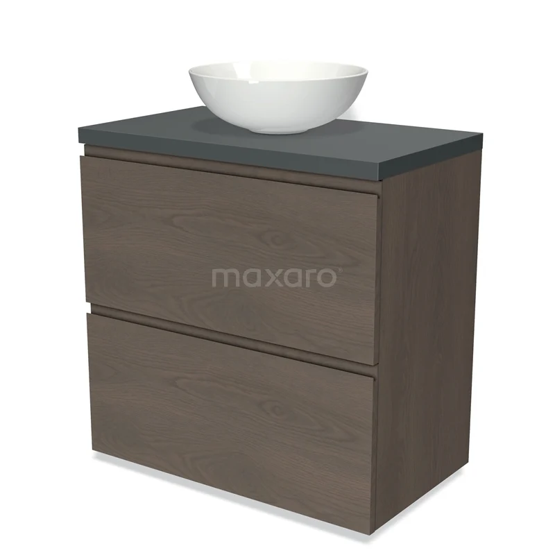 Modulo Plato Badmöbel mit Aufsatzwaschbecken | 80 cm Dunkelbraune Eiche Grifflos front Dunkelgrau blatt 2 hohe Schubladen übereinanderliegend
