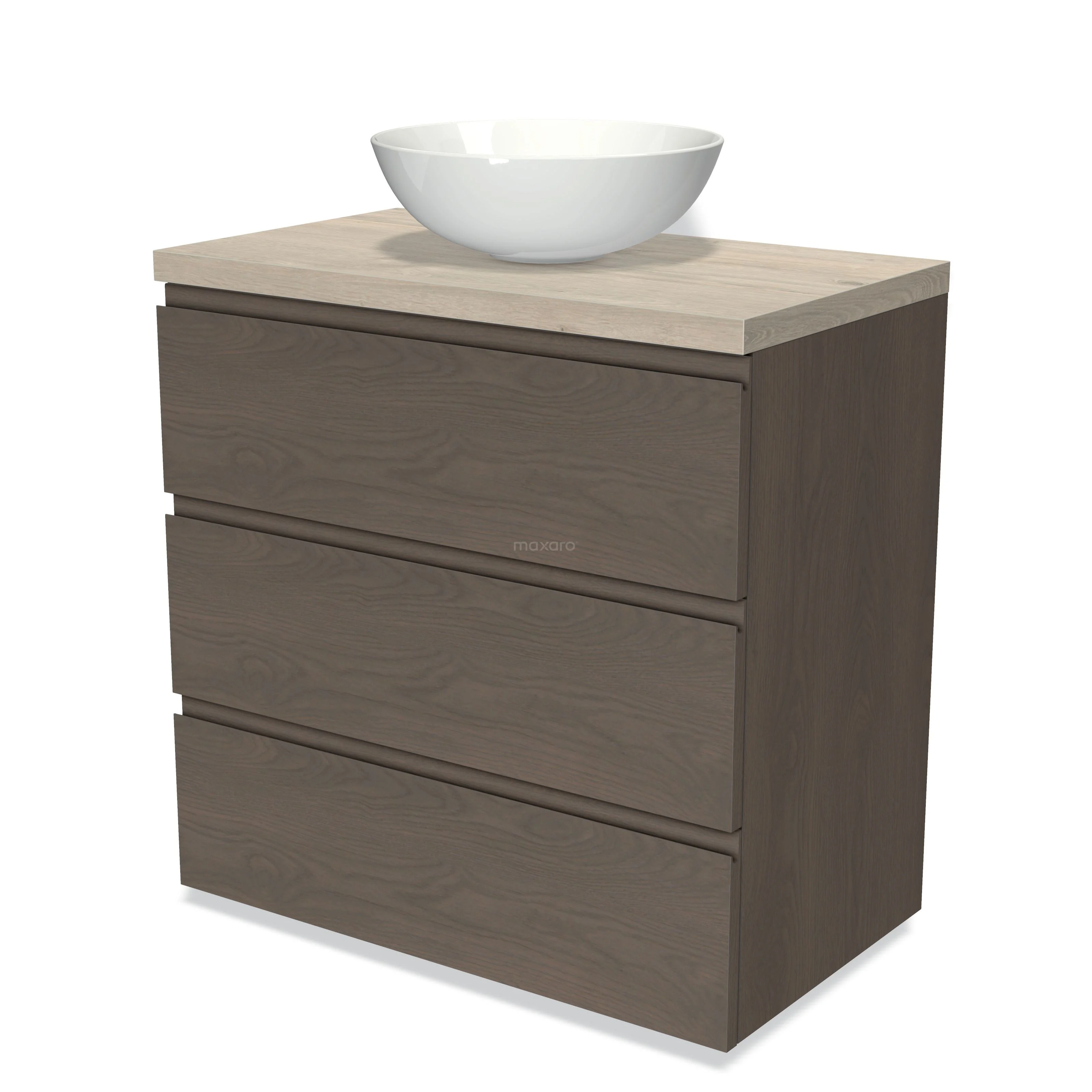 Modulo Plato Badmöbel mit Aufsatzwaschbecken | 80 cm Dunkelbraune Eiche Grifflos front Hellgraue Eiche blatt 3 Schubladen