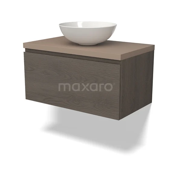Modulo Plato Badmöbel mit Aufsatzwaschbecken | 80 cm Dunkelbraune Eiche Grifflos front Taupe blatt 1 Schublade