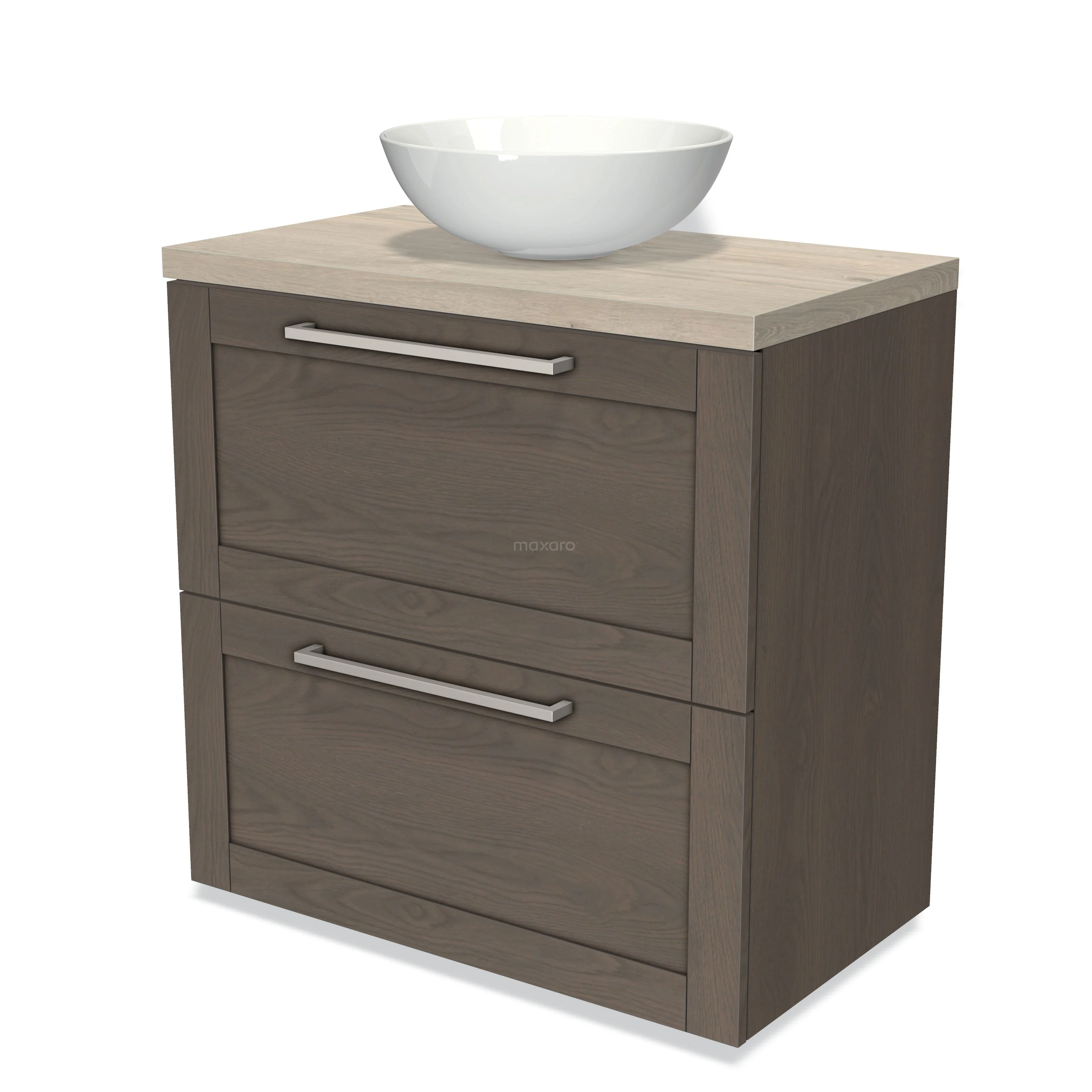 Modulo Plato Badmöbel mit Aufsatzwaschbecken | 80 cm Dunkelbraune Eiche Rahmen front Hellgraue Eiche blatt 2 hohe Schubladen übereinanderliegend