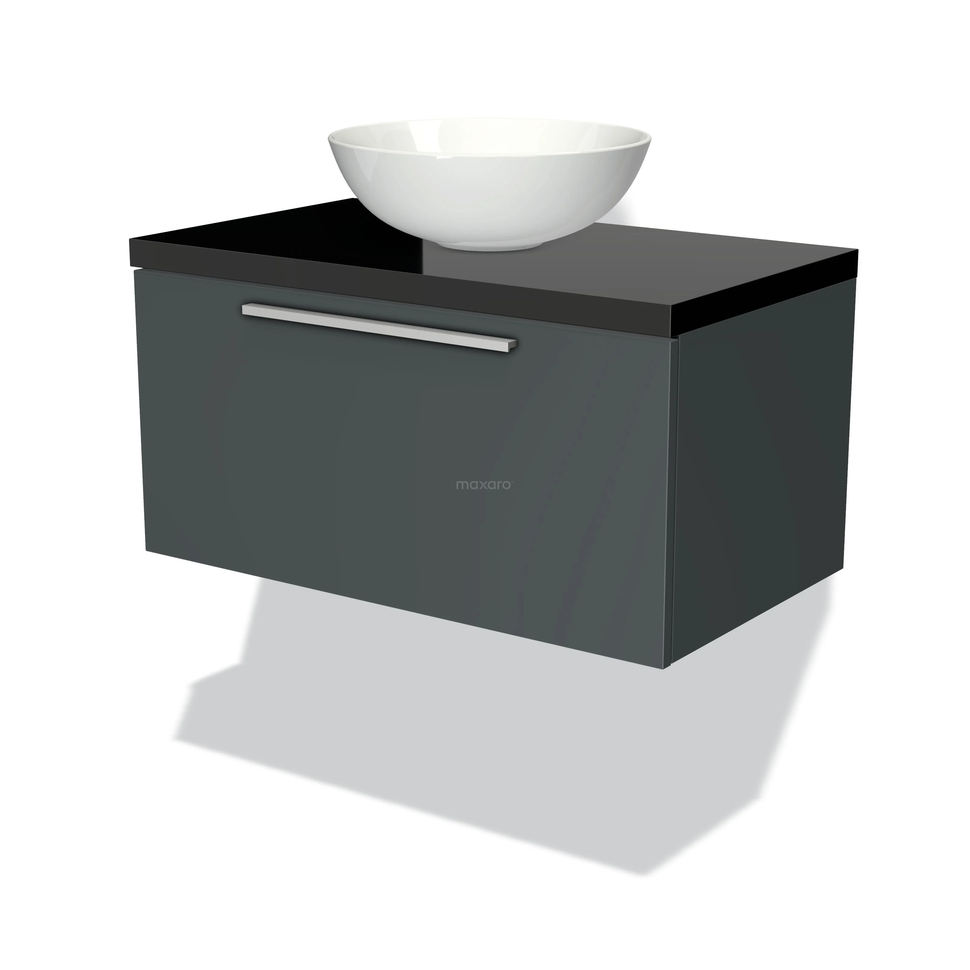 Modulo Plato Badmöbel mit Aufsatzwaschbecken | 80 cm Dunkelgrau Flach front Hochglanz Schwarz blatt 1 Schublade