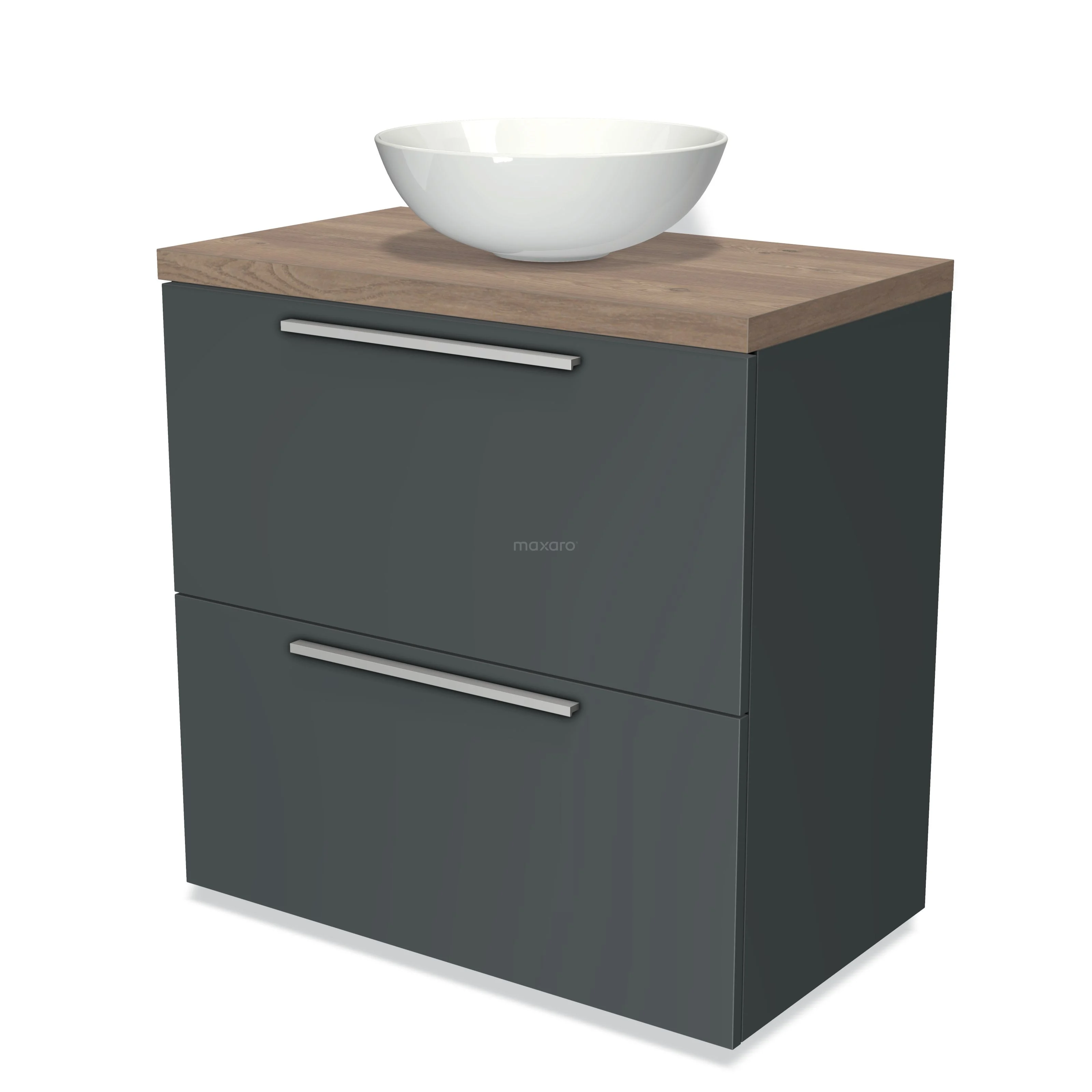 Modulo Plato Badmöbel mit Aufsatzwaschbecken | 80 cm Dunkelgrau Flach front Mittelbraune Eiche blatt 2 hohe Schubladen übereinanderliegend