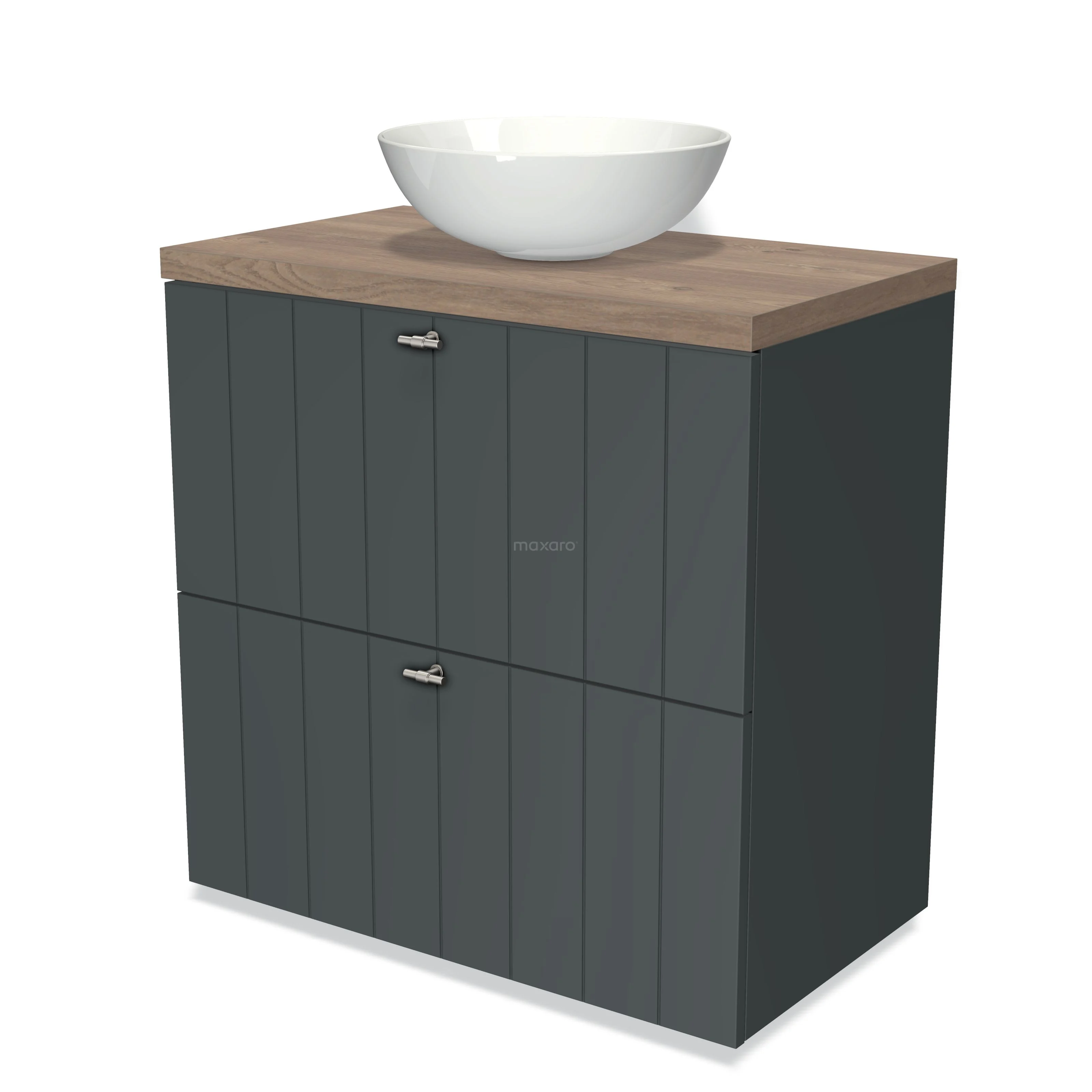 Modulo Plato Badmöbel mit Aufsatzwaschbecken | 80 cm Dunkelgrau Lamelle front Mittelbraune Eiche blatt 2 hohe Schubladen übereinanderliegend
