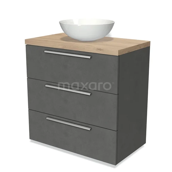 Modulo Plato Badmöbel mit Aufsatzwaschbecken | 80 cm Dunkelgrauer Beton Flach front Hellbraune Eiche blatt 3 Schubladen