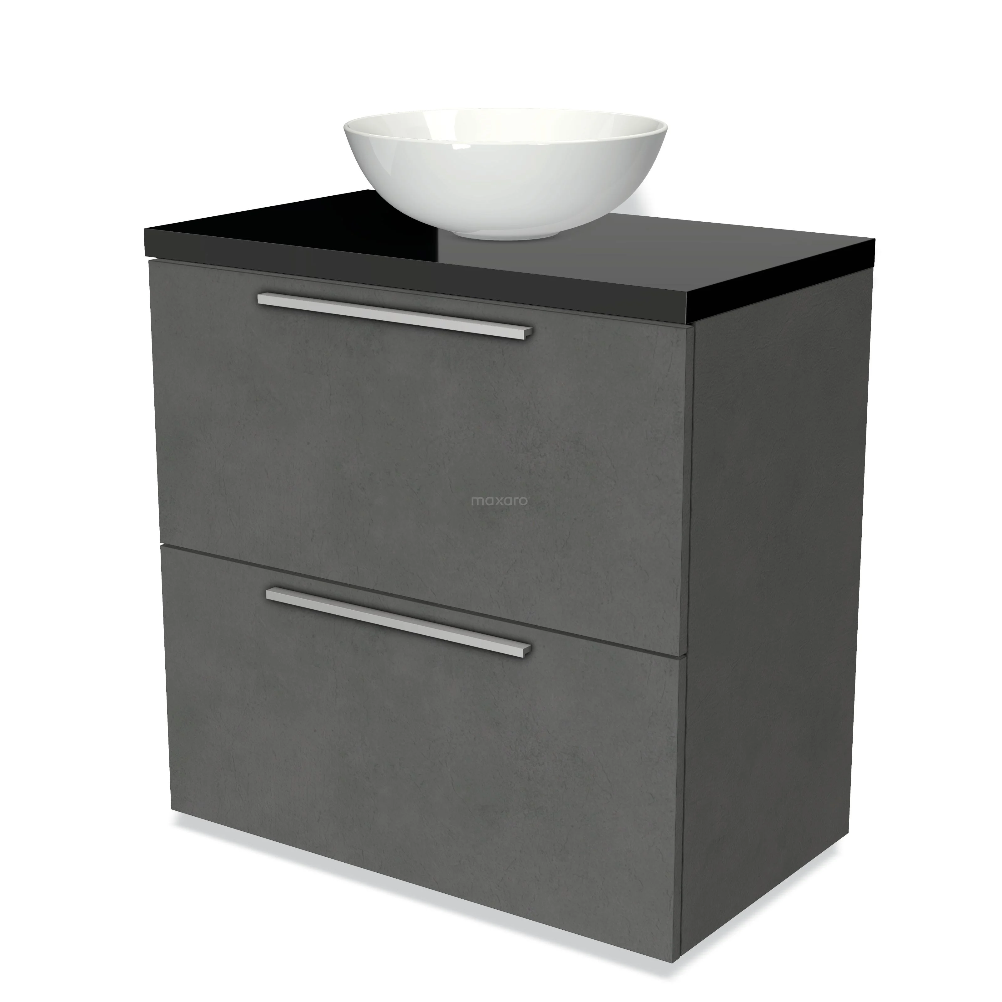 Modulo Plato Badmöbel mit Aufsatzwaschbecken | 80 cm Dunkelgrauer Beton Flach front Hochglanz Schwarz blatt 2 hohe Schubladen übereinanderliegend