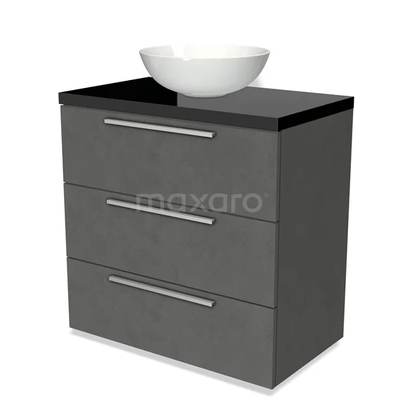 Modulo Plato Badmöbel mit Aufsatzwaschbecken | 80 cm Dunkelgrauer Beton Flach front Hochglanz Schwarz blatt 3 Schubladen