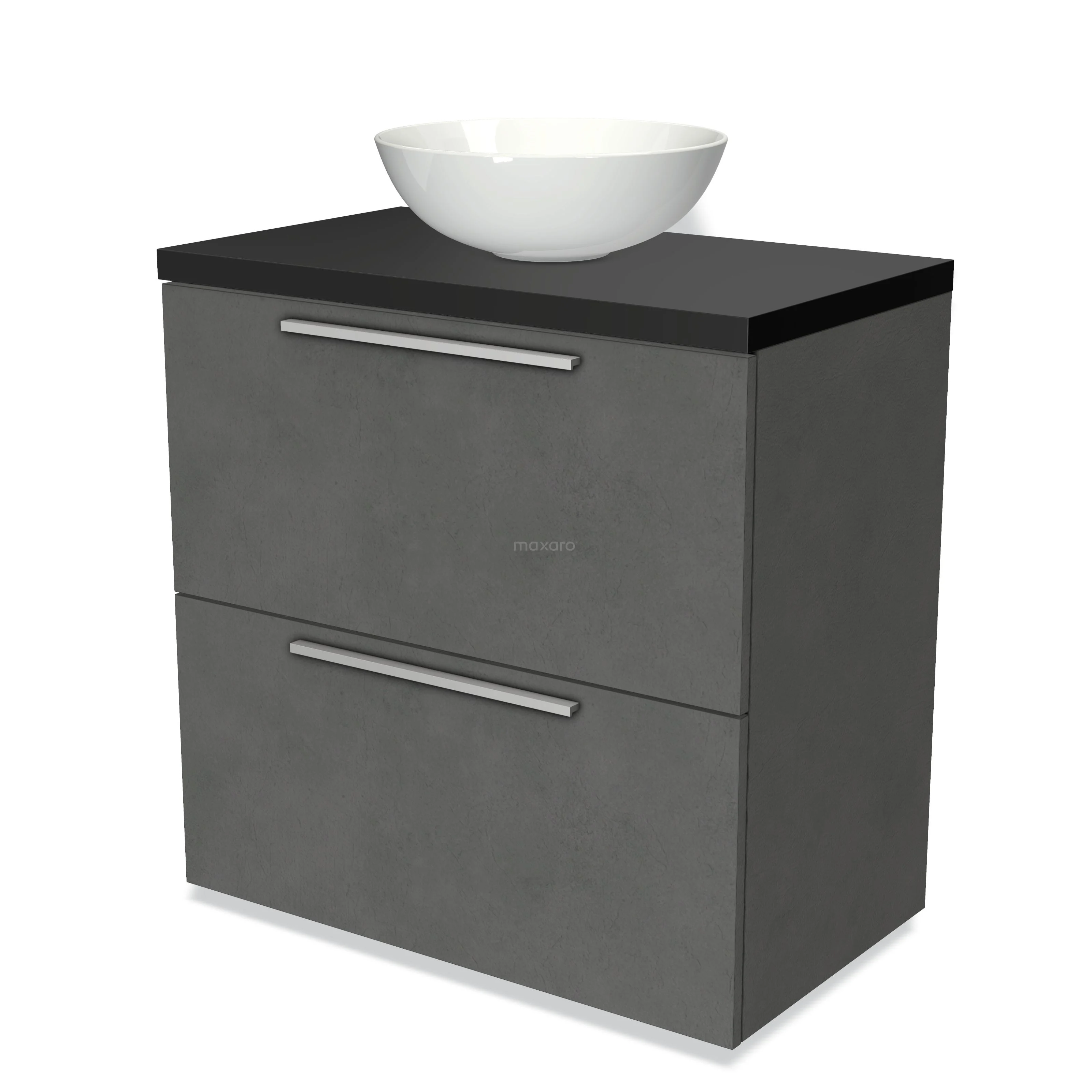 Modulo Plato Badmöbel mit Aufsatzwaschbecken | 80 cm Dunkelgrauer Beton Flach front Matt Schwarz blatt 2 hohe Schubladen übereinanderliegend