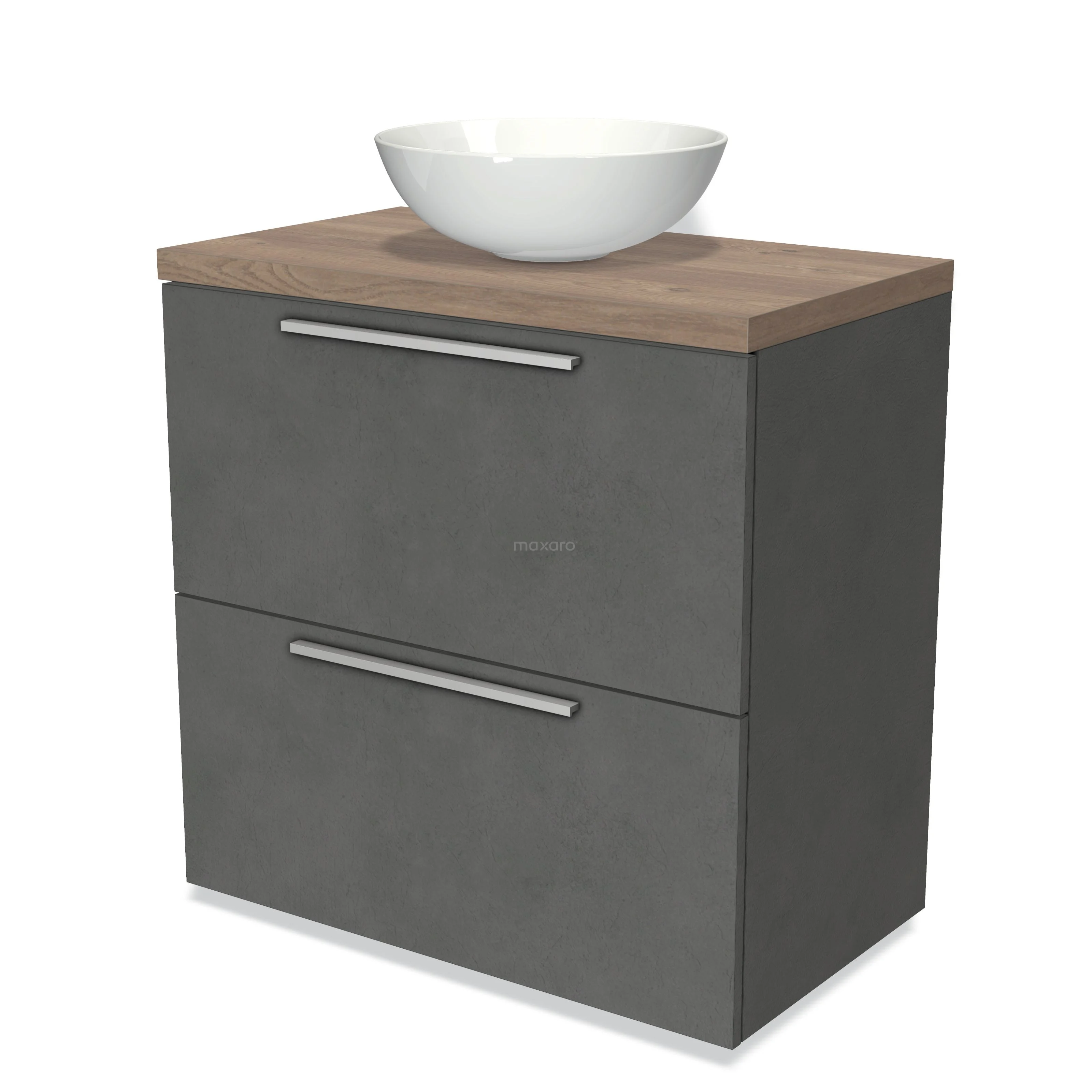 Modulo Plato Badmöbel mit Aufsatzwaschbecken | 80 cm Dunkelgrauer Beton Flach front Mittelbraune Eiche blatt 2 hohe Schubladen übereinanderliegend