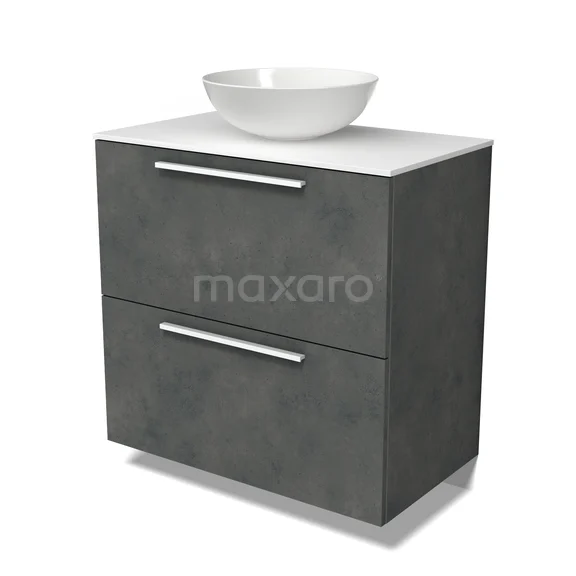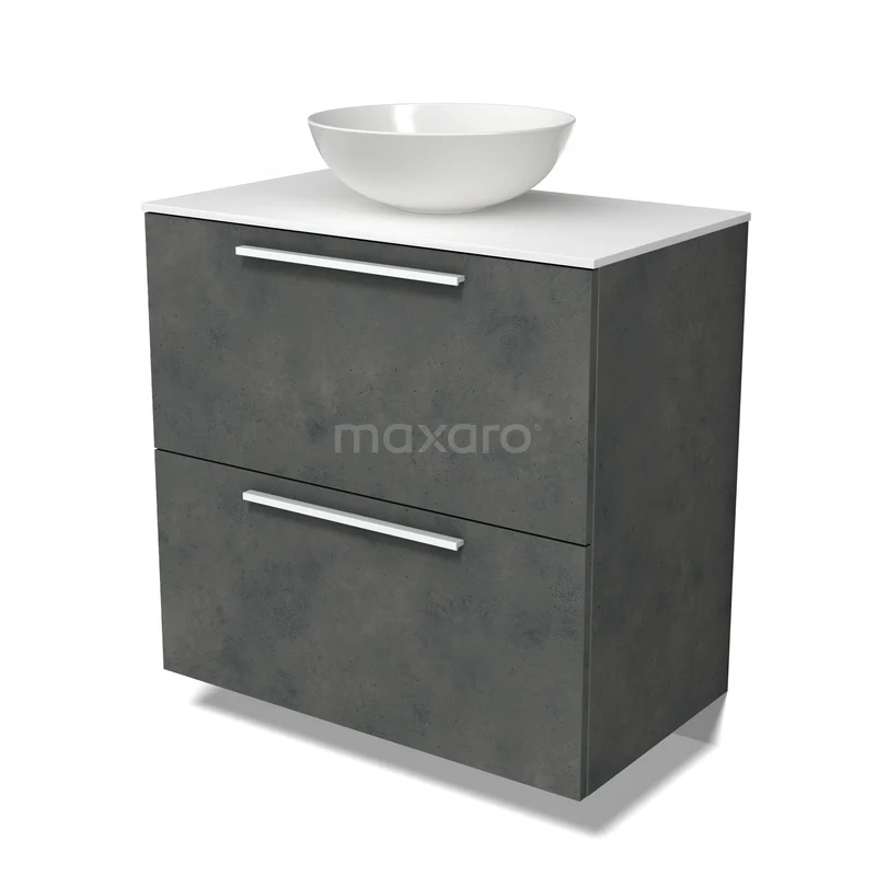 Modulo Plato Badmöbel mit Aufsatzwaschbecken | 80 cm Dunkelgrauer Beton Flach front Solid Surface blatt 2 hohe Schubladen übereinanderliegend