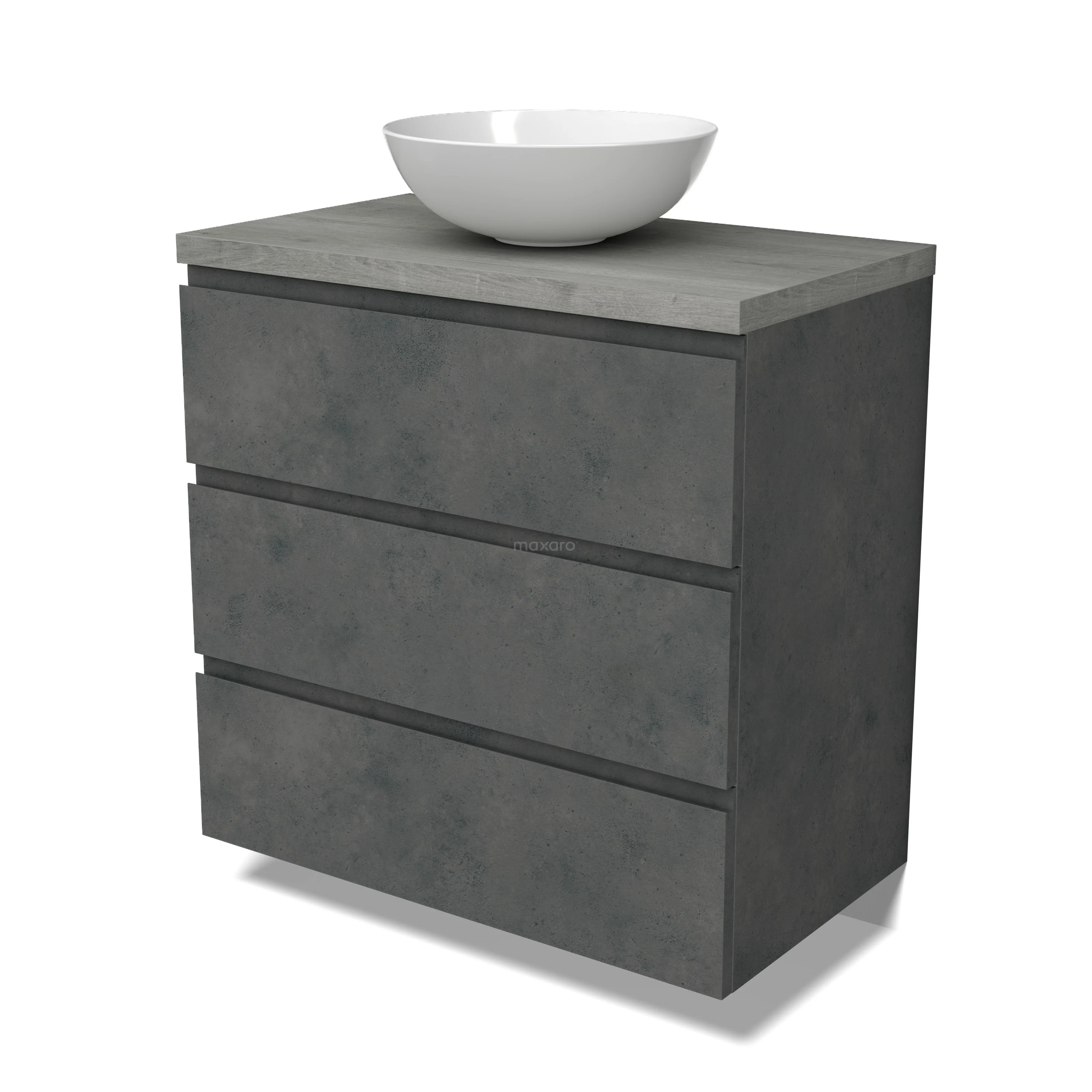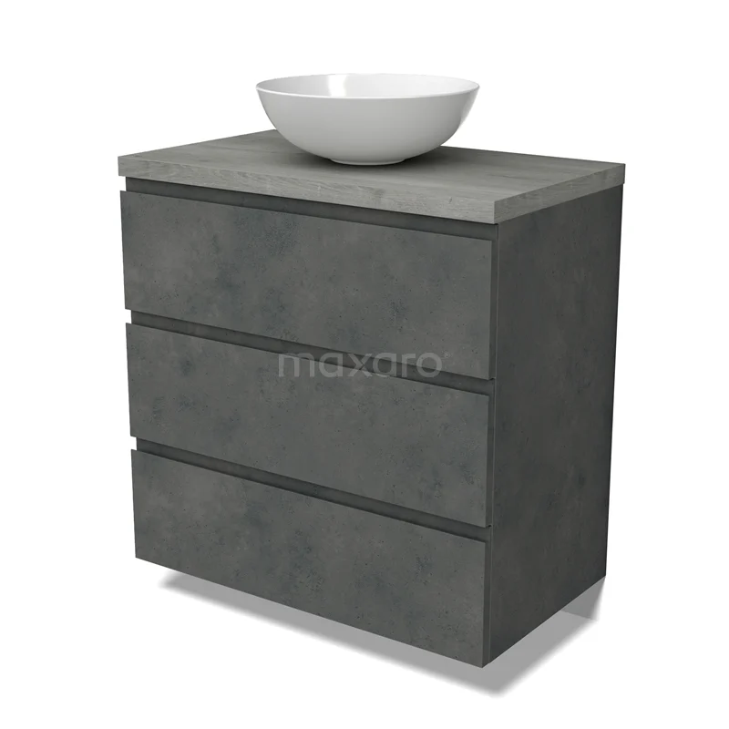 Modulo Plato Badmöbel mit Aufsatzwaschbecken | 80 cm Dunkelgrauer Beton Grifflos front Graue Eiche blatt 3 Schubladen