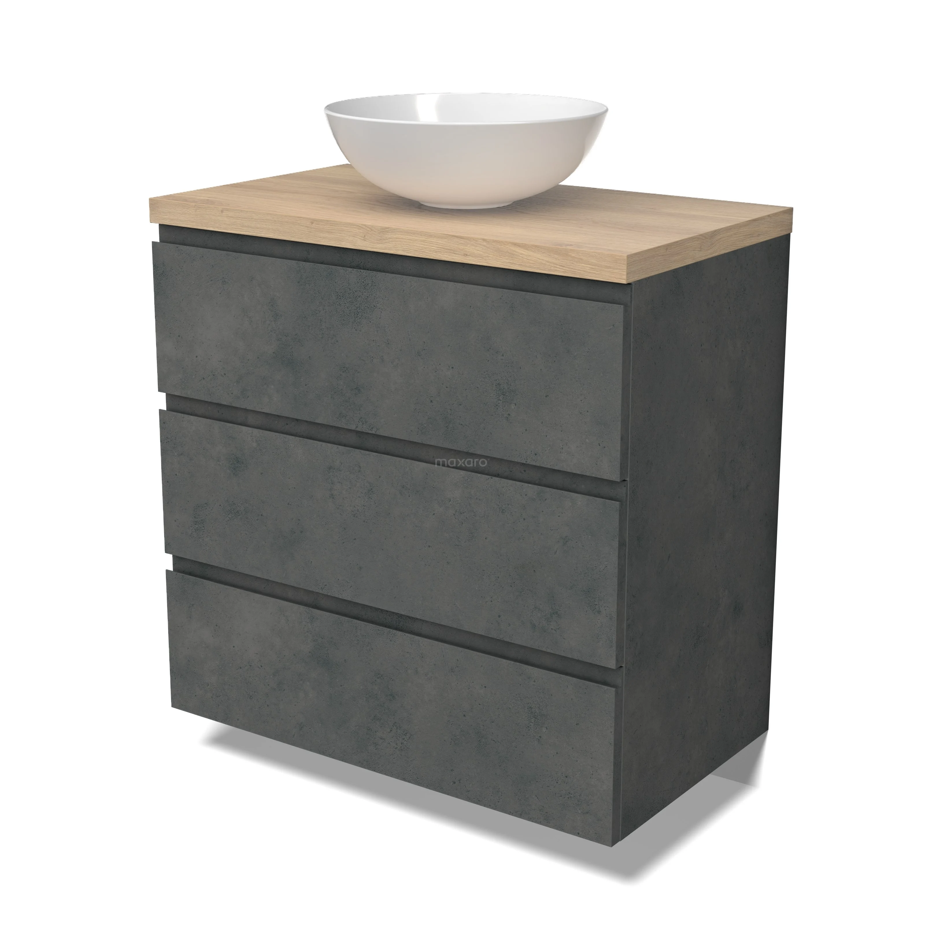 Modulo Plato Badmöbel mit Aufsatzwaschbecken | 80 cm Dunkelgrauer Beton Grifflos front Hellbraune Eiche blatt 3 Schubladen
