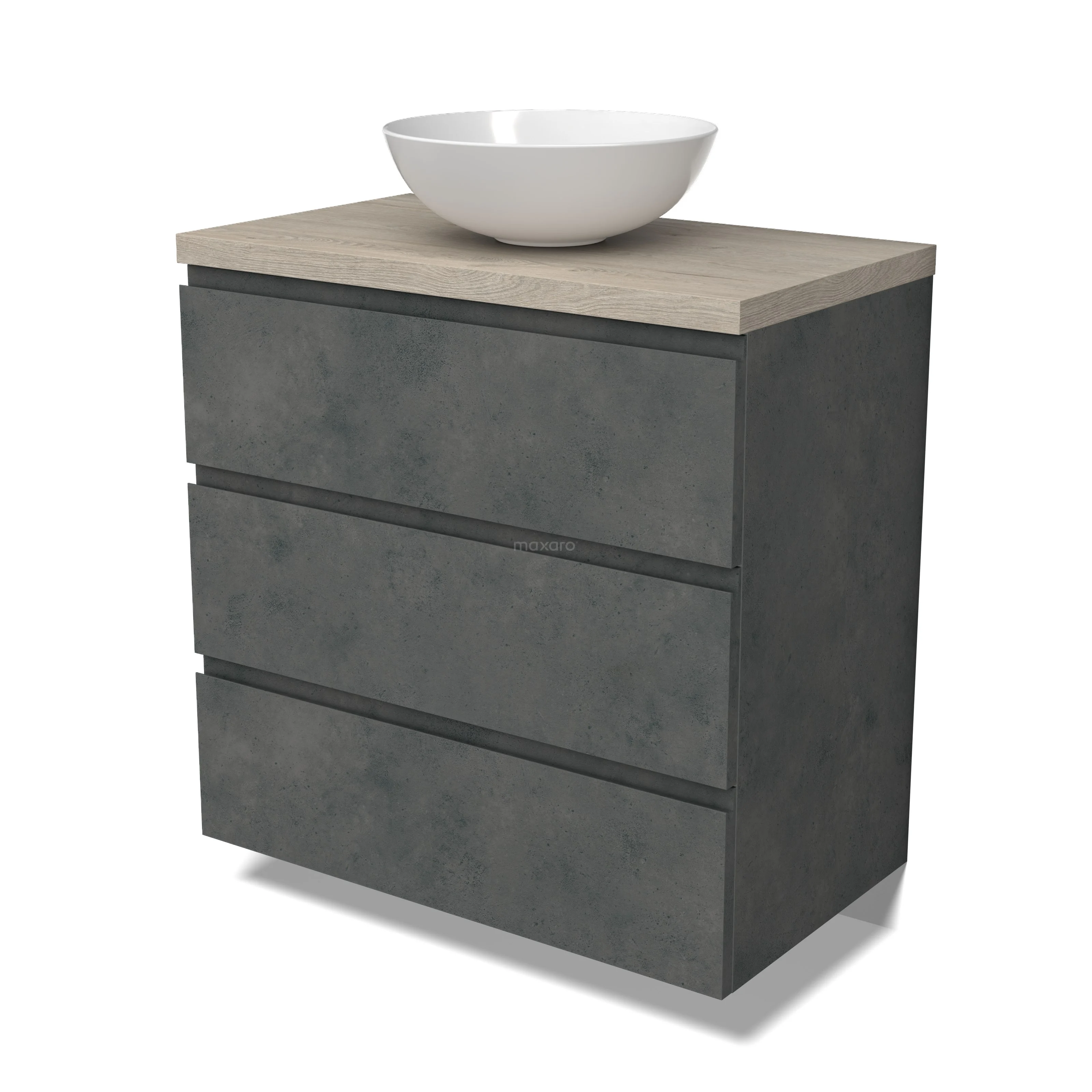 Modulo Plato Badmöbel mit Aufsatzwaschbecken | 80 cm Dunkelgrauer Beton Grifflos front Hellgraue Eiche blatt 3 Schubladen