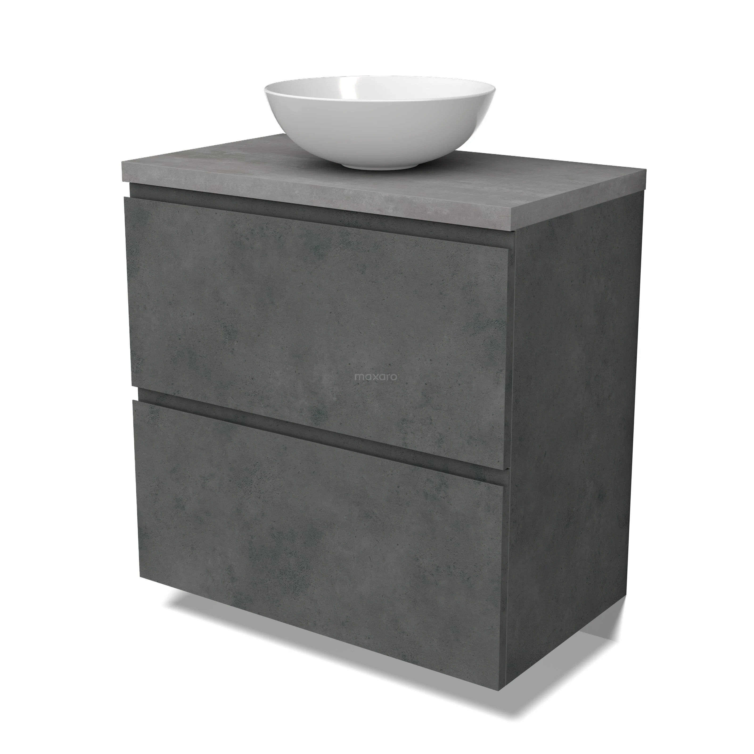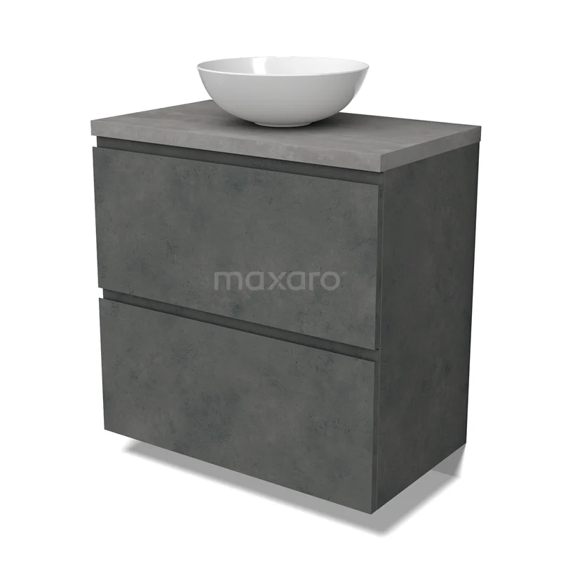 Modulo Plato Badmöbel mit Aufsatzwaschbecken | 80 cm Dunkelgrauer Beton Grifflos front Hellgrauer Beton blatt 2 hohe Schubladen übereinanderliegend