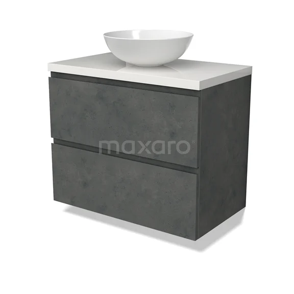 Modulo Plato Badmöbel mit Aufsatzwaschbecken | 80 cm Dunkelgrauer Beton Grifflos front Hochglanz Weiß blatt 2 übereinanderliegende Schubladen