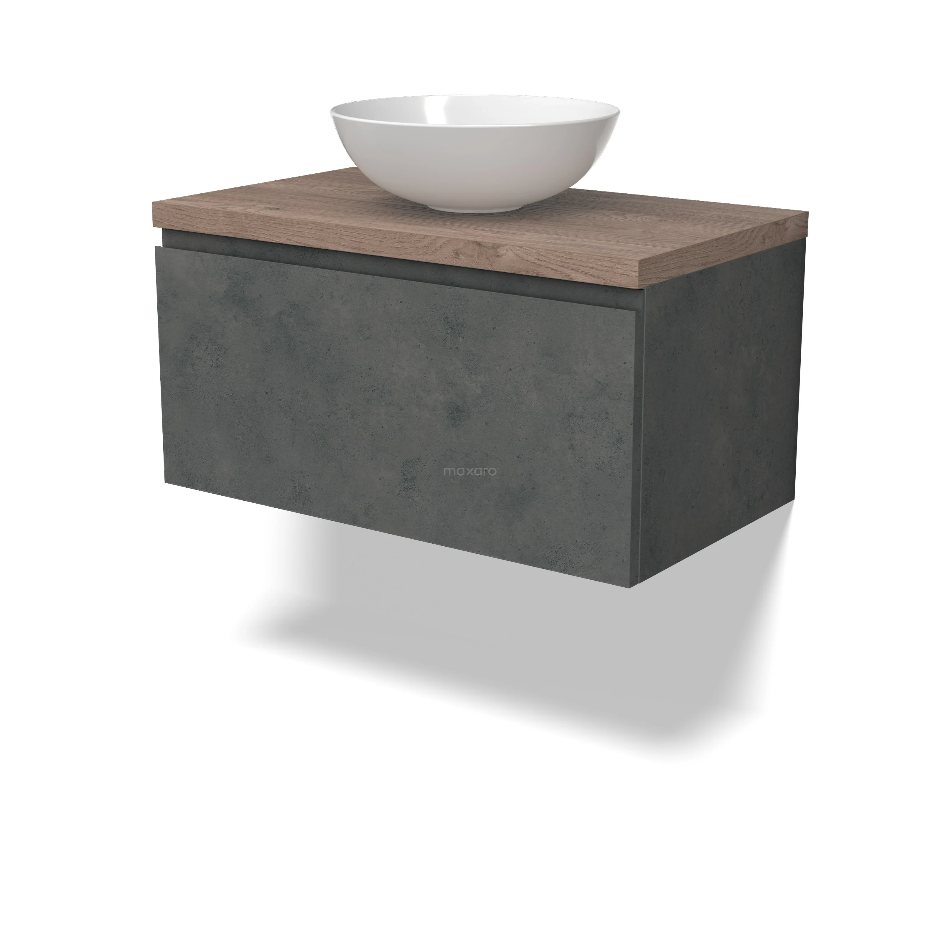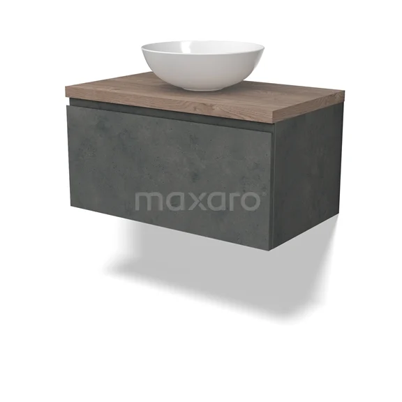 Modulo Plato Badmöbel mit Aufsatzwaschbecken | 80 cm Dunkelgrauer Beton Grifflos front Mittelbraune Eiche blatt 1 Schublade