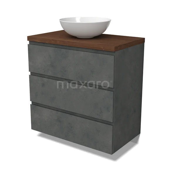 Modulo Plato Badmöbel mit Aufsatzwaschbecken | 80 cm Dunkelgrauer Beton Grifflos front Walnuss blatt 3 Schubladen