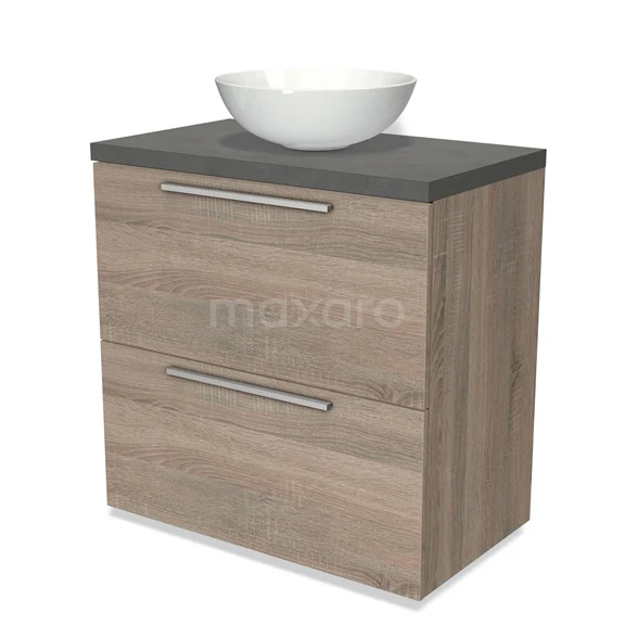Modulo Plato Badmöbel mit Aufsatzwaschbecken | 80 cm Eiche Flach front Dunkelgrauer Beton blatt 2 hohe Schubladen übereinanderliegend