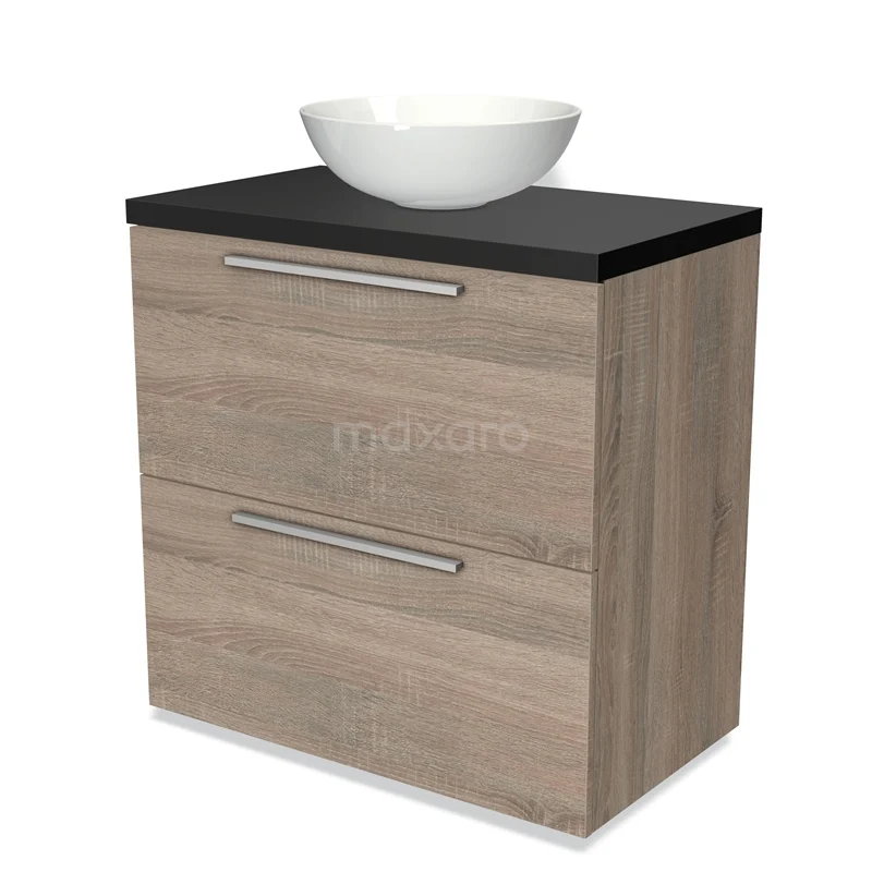 Modulo Plato Badmöbel mit Aufsatzwaschbecken | 80 cm Eiche Flach front Matt Schwarz blatt 2 hohe Schubladen übereinanderliegend