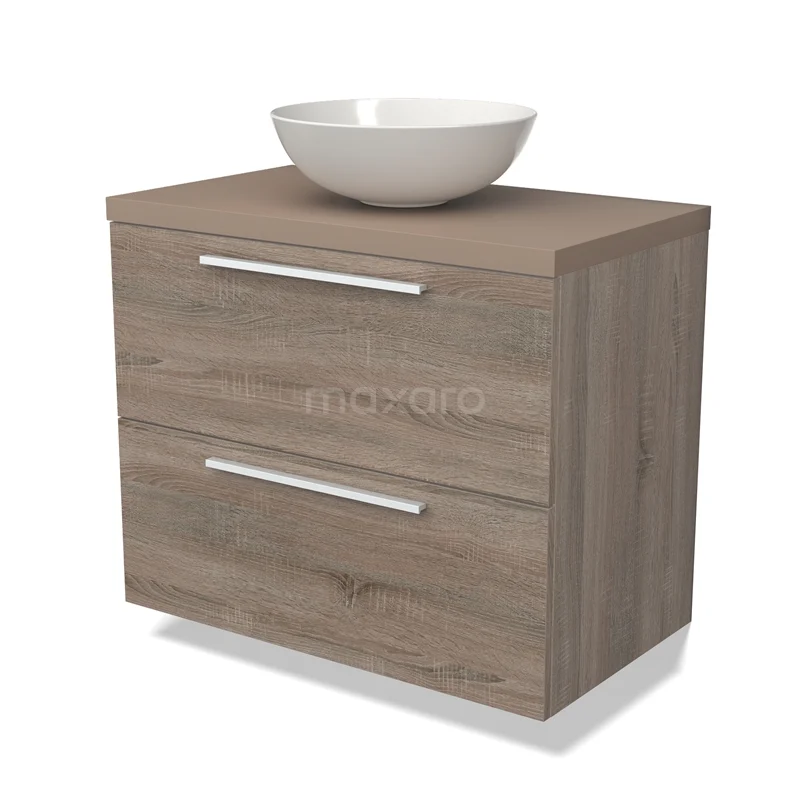 Modulo Plato Badmöbel mit Aufsatzwaschbecken | 80 cm Eiche Flach front Taupe blatt 2 übereinanderliegende Schubladen