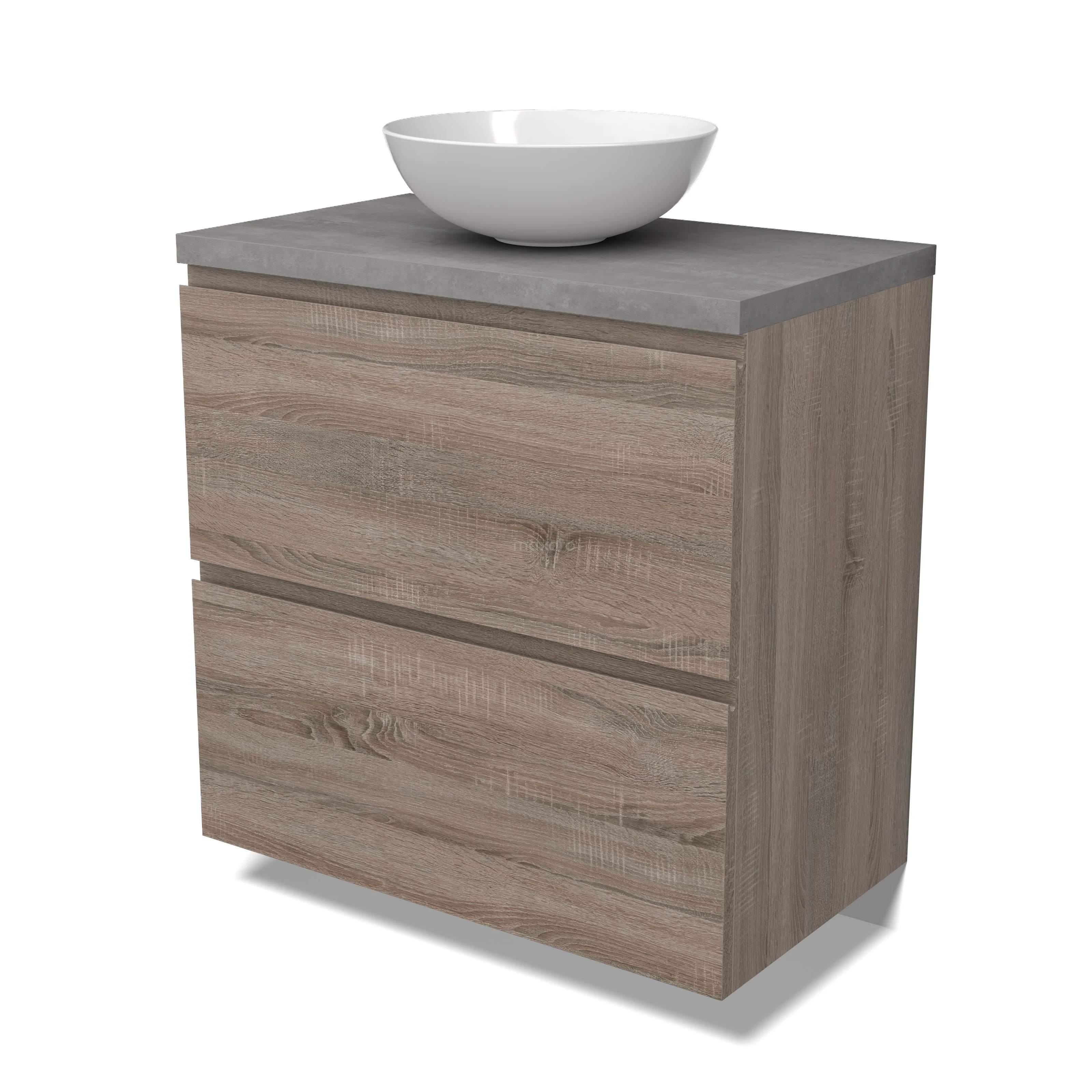 Modulo Plato Badmöbel mit Aufsatzwaschbecken | 80 cm Eiche Grifflos front Hellgrauer Beton blatt 2 hohe Schubladen übereinanderliegend