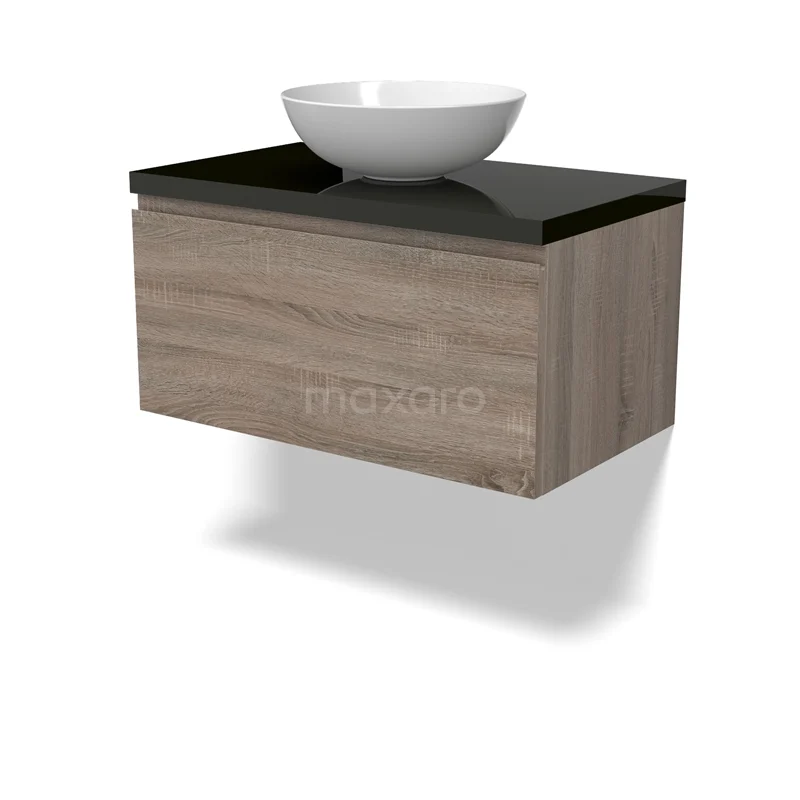 Modulo Plato Badmöbel mit Aufsatzwaschbecken | 80 cm Eiche Grifflos front Hochglanz Schwarz blatt 1 Schublade