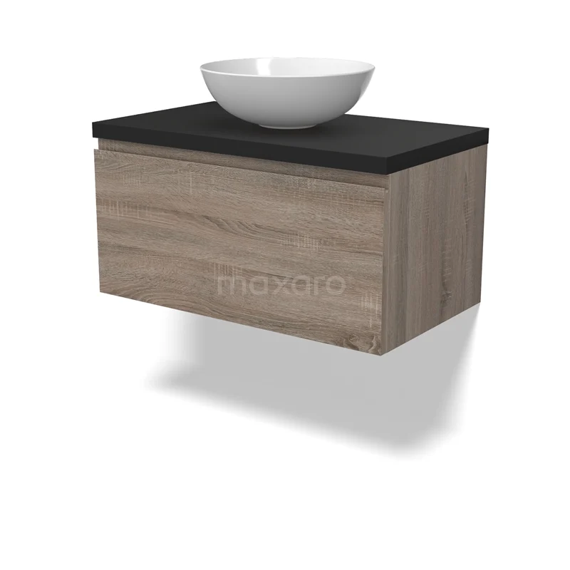 Modulo Plato Badmöbel mit Aufsatzwaschbecken | 80 cm Eiche Grifflos front Matt Schwarz blatt 1 Schublade