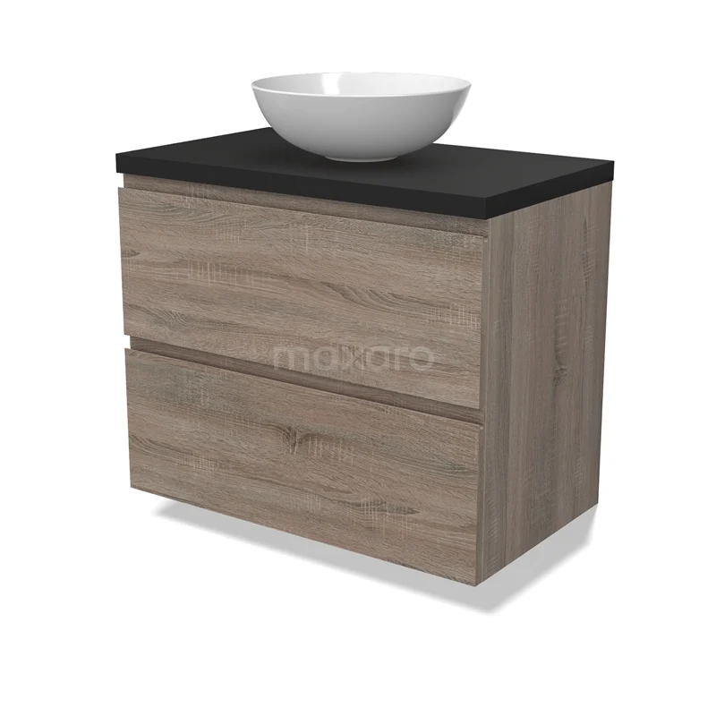 Modulo Plato Badmöbel mit Aufsatzwaschbecken | 80 cm Eiche Grifflos front Matt Schwarz blatt 2 übereinanderliegende Schubladen