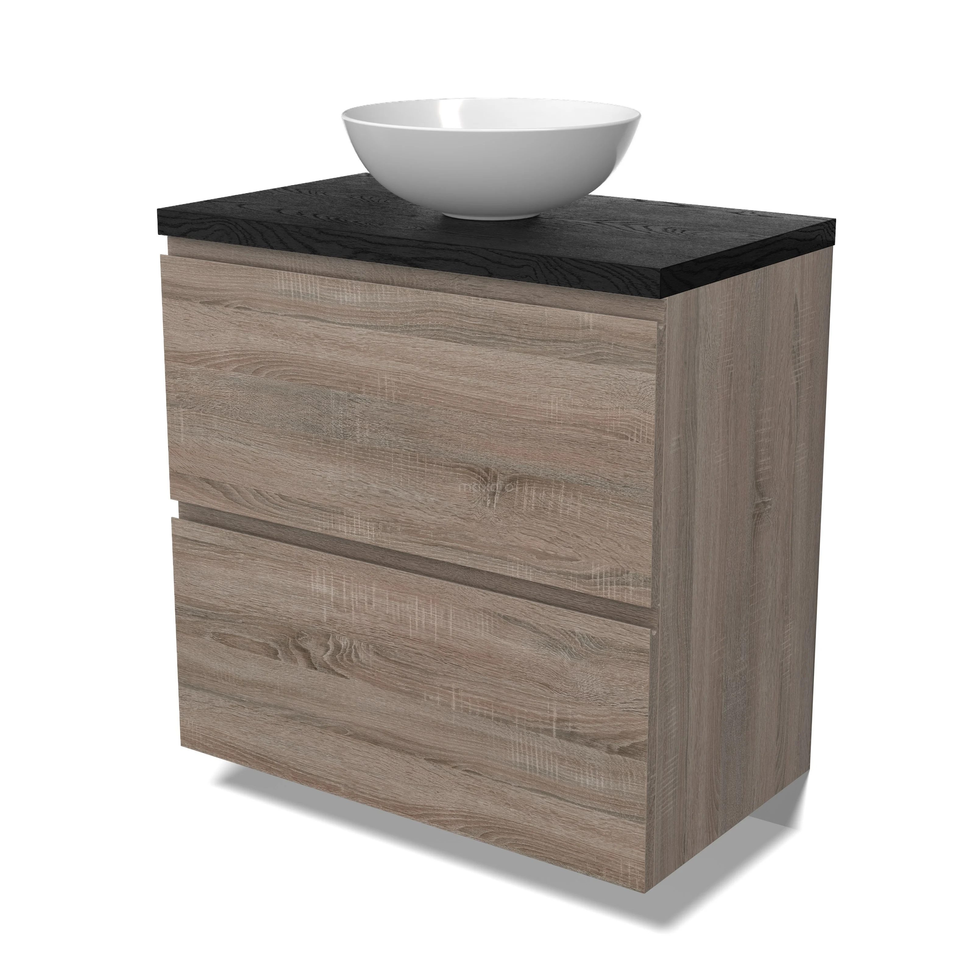 Modulo Plato Badmöbel mit Aufsatzwaschbecken | 80 cm Eiche Grifflos front Schwarze Eiche blatt 2 hohe Schubladen übereinanderliegend