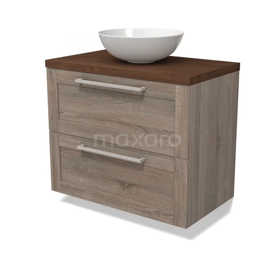 Modulo Plato Badmöbel mit Aufsatzwaschbecken | 80 cm Eiche Rahmen front Walnuss blatt 2 übereinanderliegende Schubladen