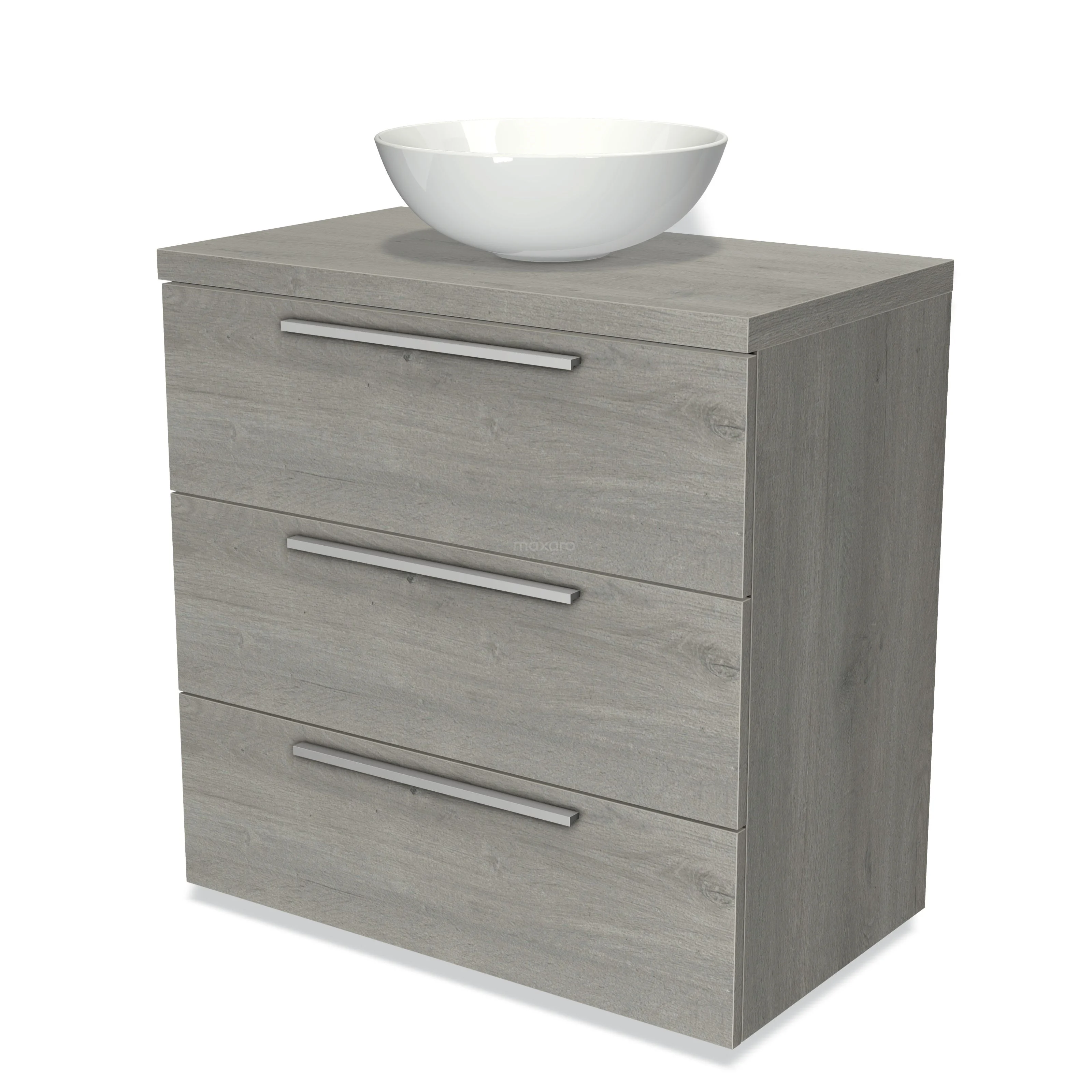 Modulo Plato Badmöbel mit Aufsatzwaschbecken | 80 cm Graue Eiche Flach front Graue Eiche blatt 3 Schubladen
