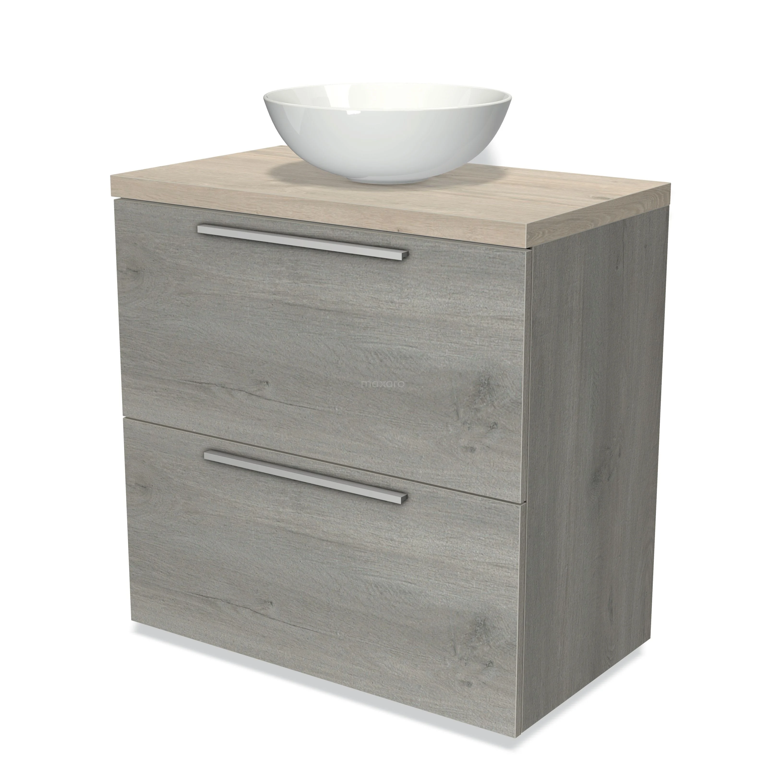 Modulo Plato Badmöbel mit Aufsatzwaschbecken | 80 cm Graue Eiche Flach front Hellgraue Eiche blatt 2 hohe Schubladen übereinanderliegend
