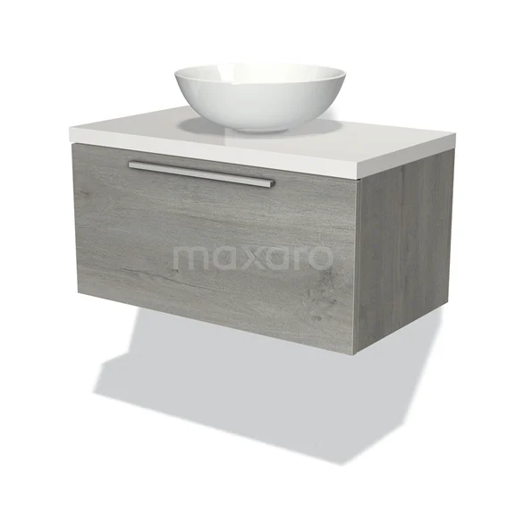 Modulo Plato Badmöbel mit Aufsatzwaschbecken | 80 cm Graue Eiche Flach front Hochglanz Weiß blatt 1 Schublade