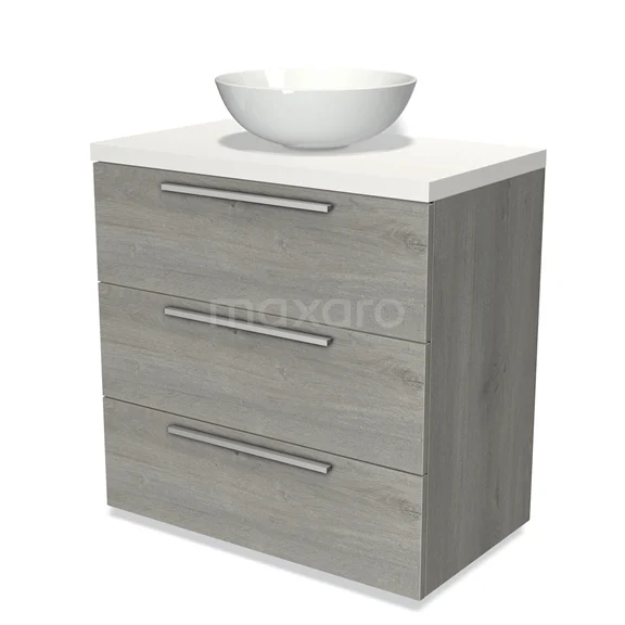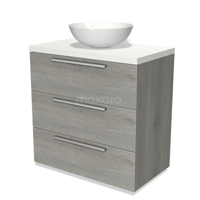 Modulo Plato Badmöbel mit Aufsatzwaschbecken | 80 cm Graue Eiche Flach front Matt Weiß blatt 3 Schubladen