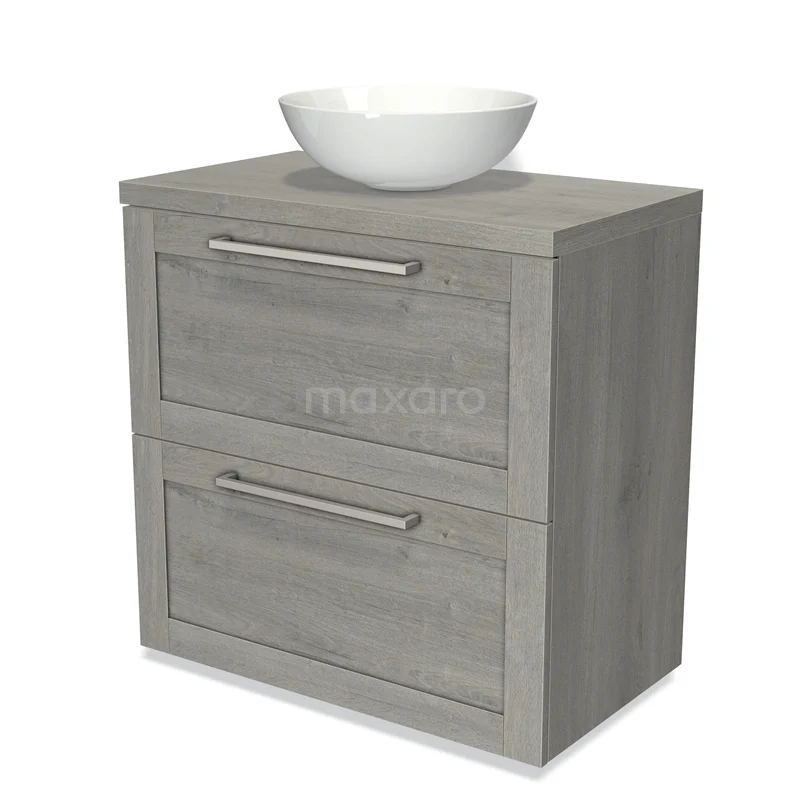 Modulo Plato Badmöbel mit Aufsatzwaschbecken | 80 cm Graue Eiche Rahmen front Graue Eiche blatt 2 hohe Schubladen übereinanderliegend