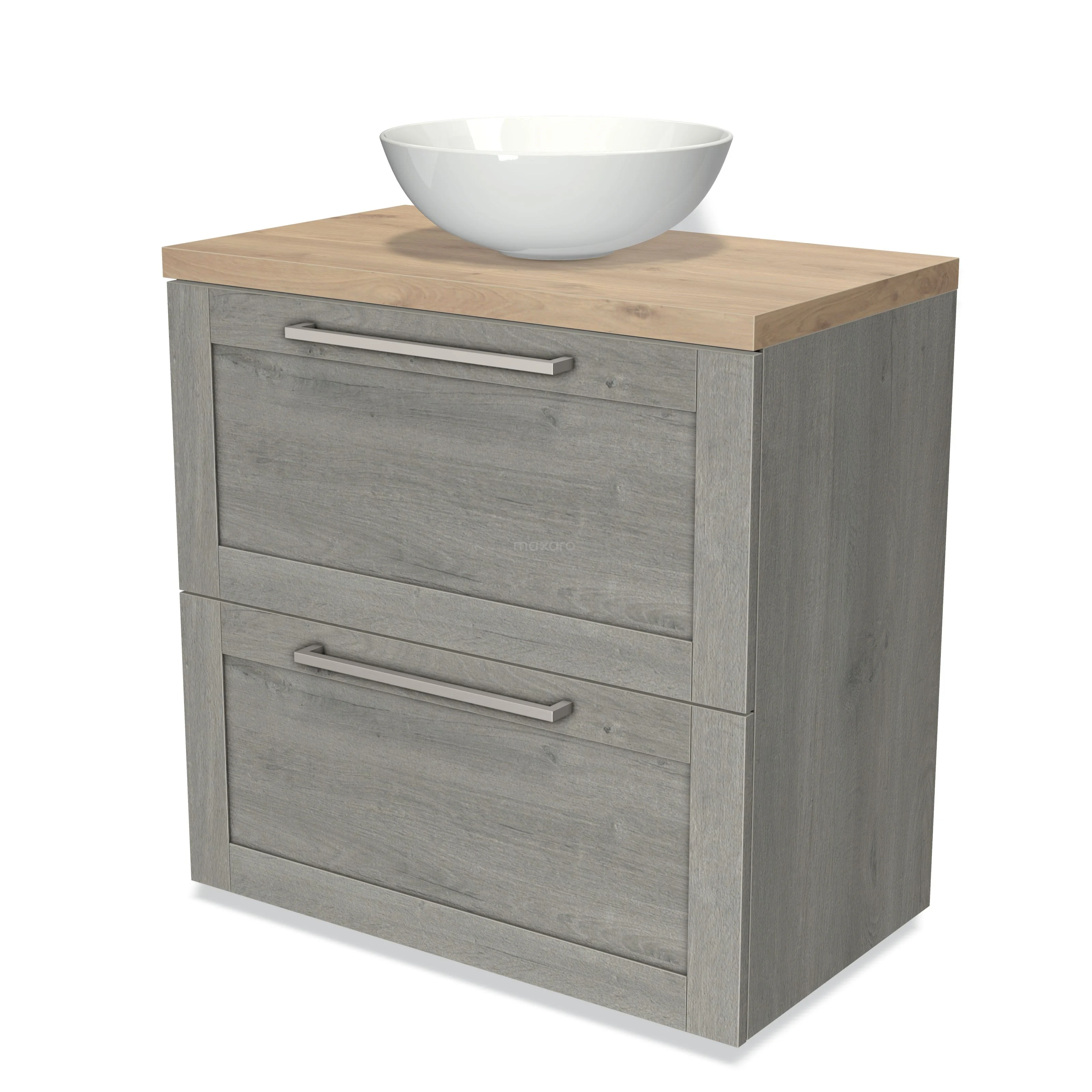 Modulo Plato Badmöbel mit Aufsatzwaschbecken | 80 cm Graue Eiche Rahmen front Hellbraune Eiche blatt 2 hohe Schubladen übereinanderliegend