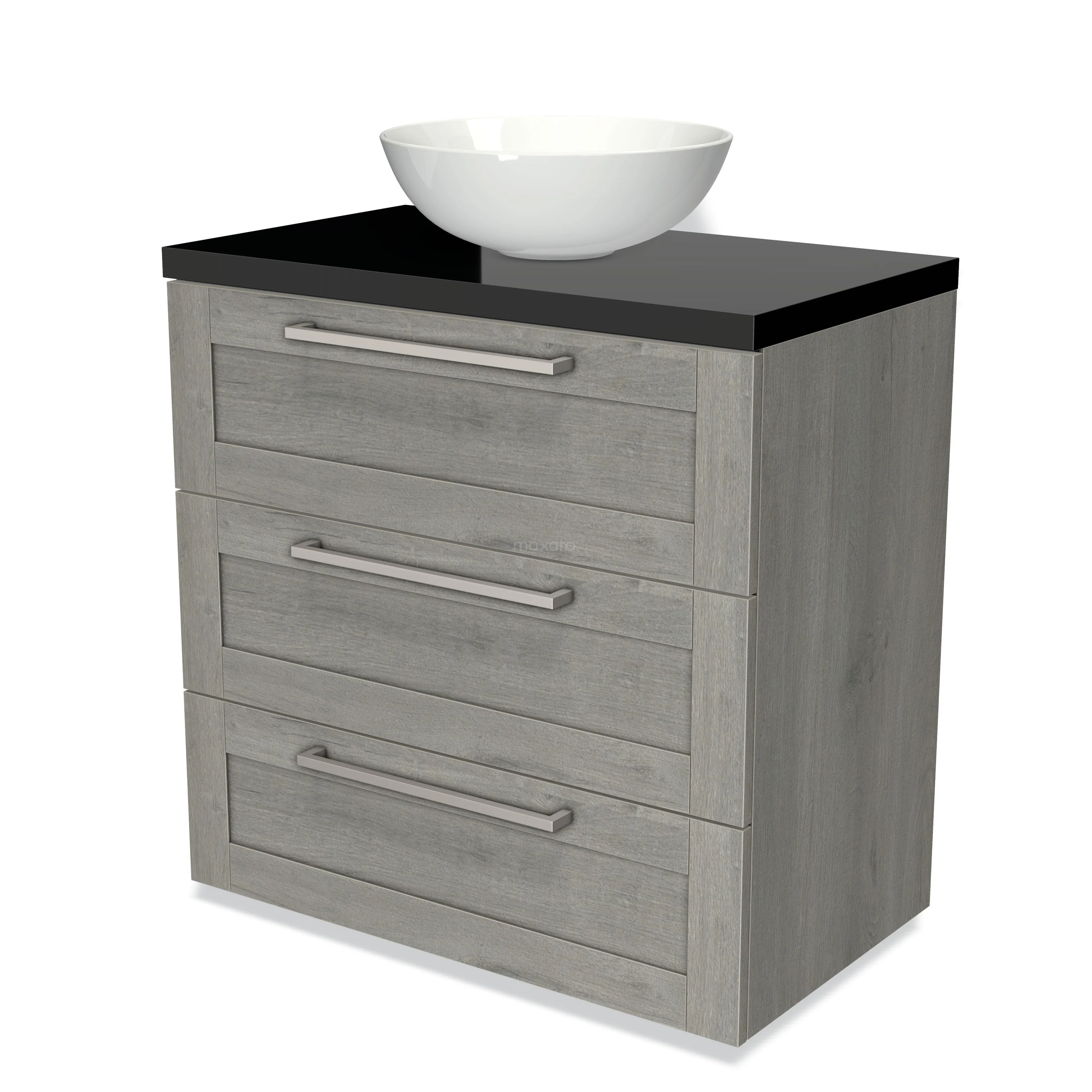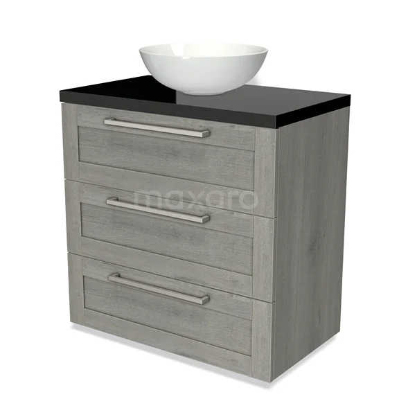 Modulo Plato Badmöbel mit Aufsatzwaschbecken | 80 cm Graue Eiche Rahmen front Hochglanz Schwarz blatt 3 Schubladen