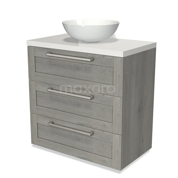 Modulo Plato Badmöbel mit Aufsatzwaschbecken | 80 cm Graue Eiche Rahmen front Hochglanz Weiß blatt 3 Schubladen